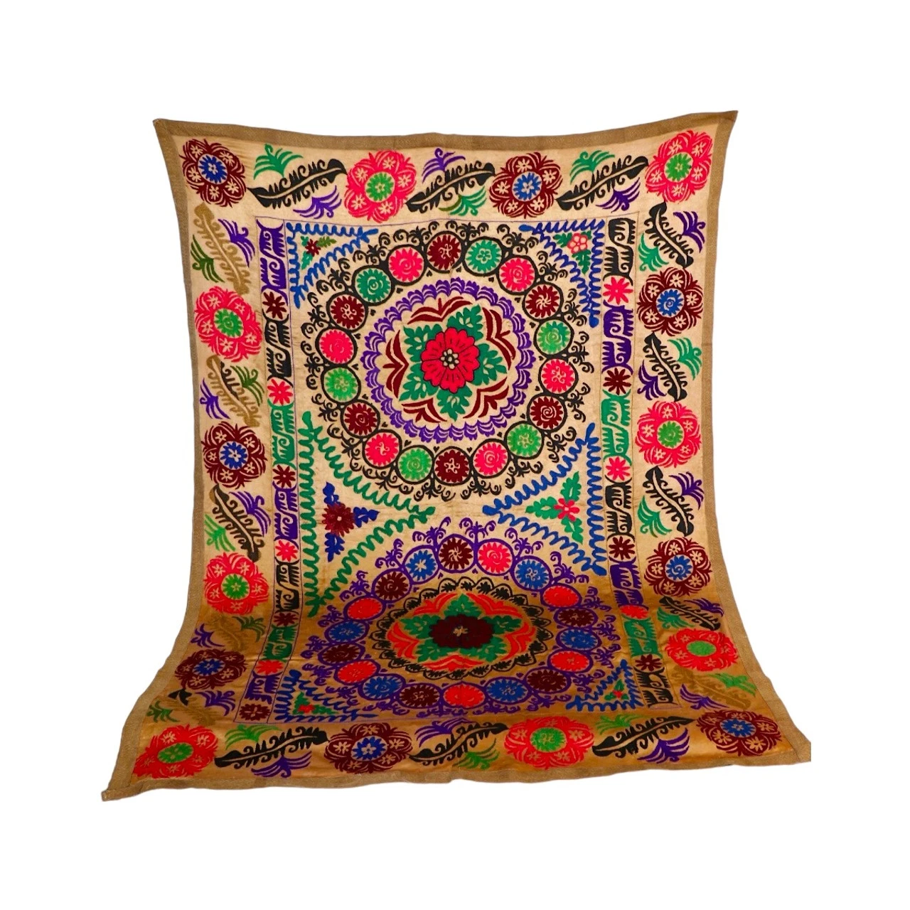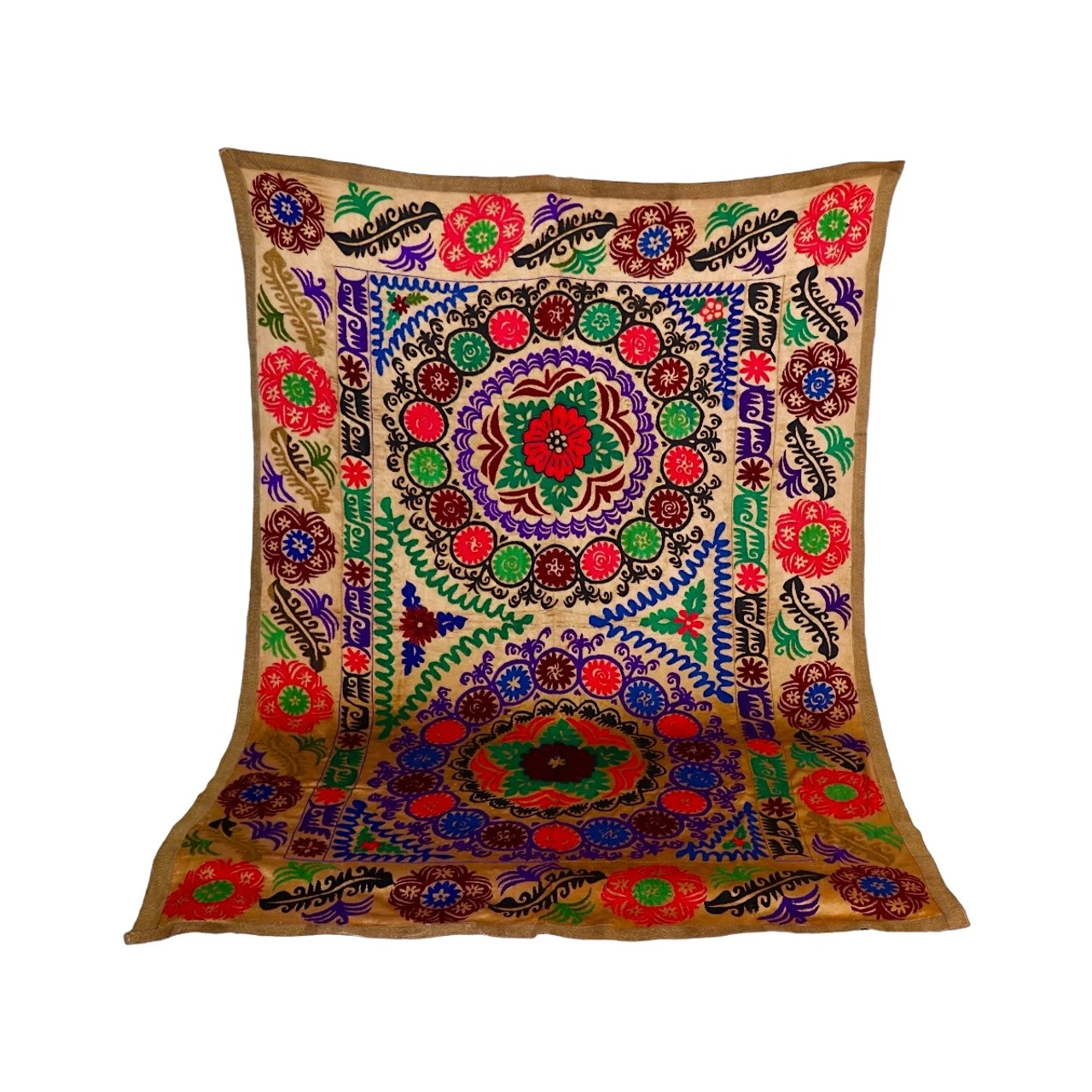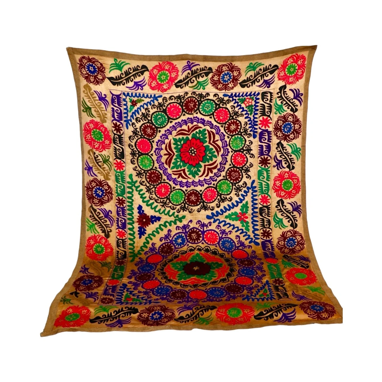 Step into the vibrant world of Uzbekistan with our Suzani Textile collection. Originating from nomadic tribes, these textiles boast intricate embroidery, vibrant colors, and elaborate motifs. Crafted with silk embroidery on cotton-backed linen, each piece, possibly from the late 19th or early 20th century, offers both durability and beauty. In excellent antique condition, our Suzani textiles serve as stunning table or bed coverings or as captivating wall décor. Immerse yourself in the artistry and history of Uzbekistan with our curated collection, bringing a piece of Central Asian heritage into your home.