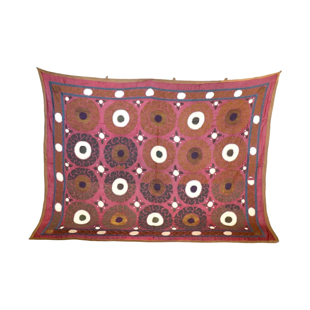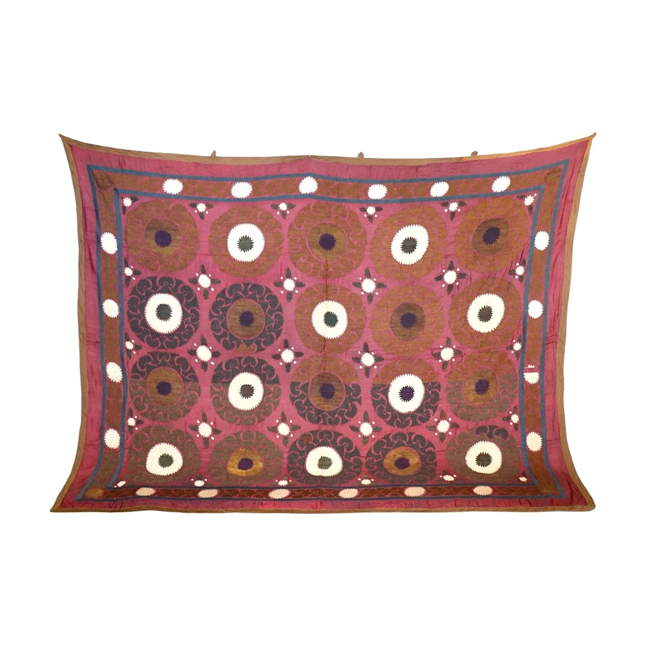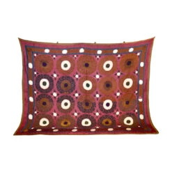 Step into the vibrant world of Uzbekistan with our Suzani Textile collection. Originating from nomadic tribes, these textiles boast intricate embroidery, vibrant colors, and elaborate motifs. Crafted with silk embroidery on cotton-backed linen, each piece, possibly from the late 19th or early 20th century, offers both durability and beauty. In excellent antique condition, our Suzani textiles serve as stunning table or bed coverings or as captivating wall décor. Immerse yourself in the artistry and history of Uzbekistan with our curated collection, bringing a piece of Central Asian heritage into your home.