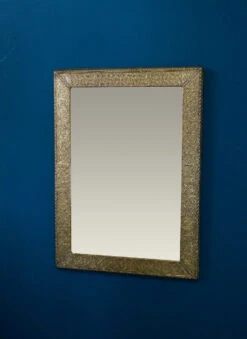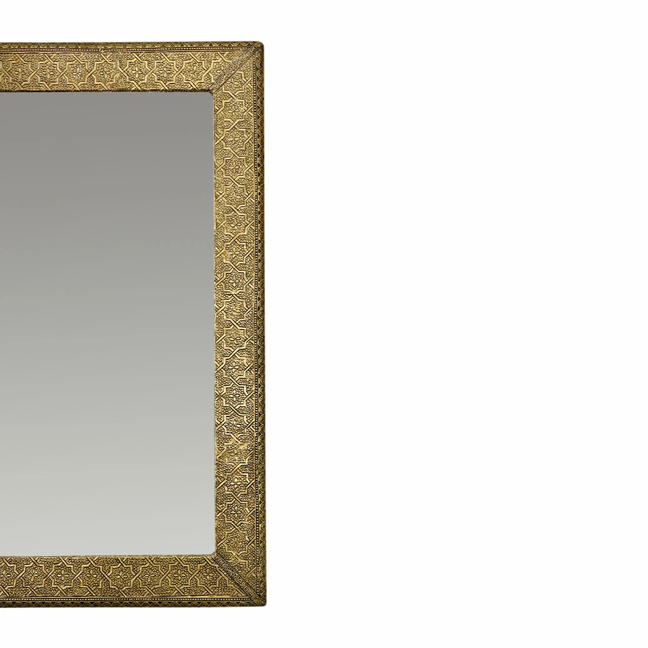 Moroccan arabesque brass metal mirror, characterized by its luxurious golden sheen and intricate embossed patterns that cover the wood frame, features motifs that are likely traditional in Moroccan design.Â