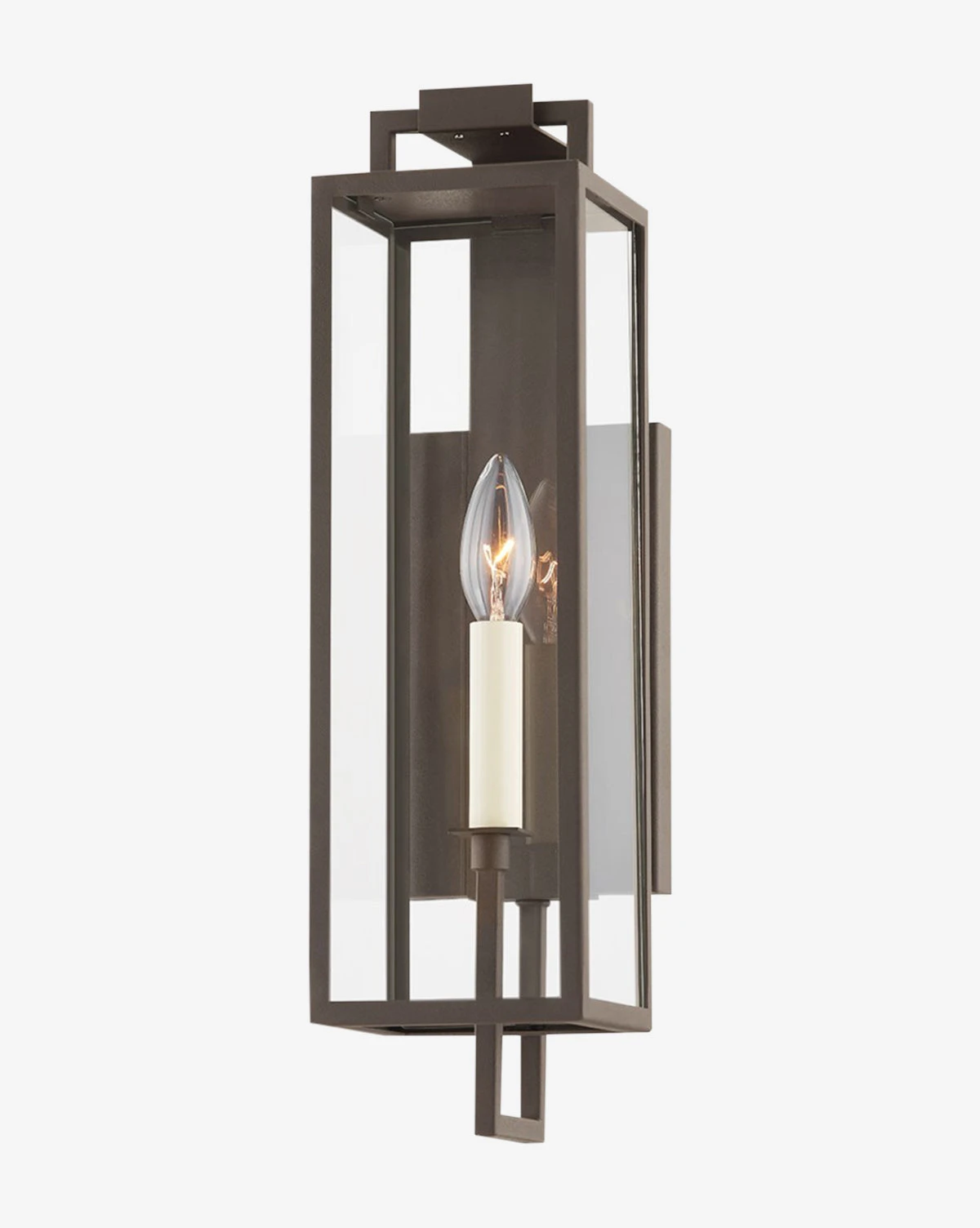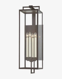The Beckham Wall Sconce is a modern yet industrial cage lantern with a streamlined design. A metal structure with either a forged iron or textured bronze finish frames glass panels to reveal the candle-inspired bulbs. Beautiful from each angle, the sconce brings subtly warm light to your outdoor spaces.