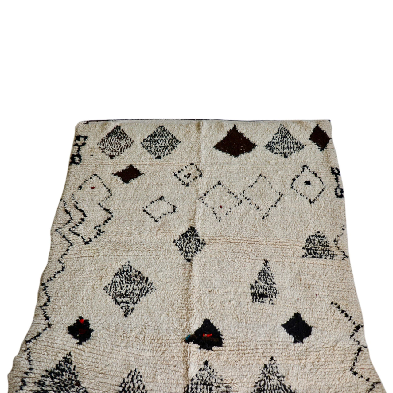Perfect for apartments and small spaces, this vintage Berber carpet comes from Beni Ourain tribe in the Atlas Mountains of Morocco and works well next to the bed or in an entryway.