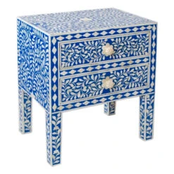 A beautiful addition to any bedroom or bathroom, this two-drawer bone-inlaid nightstand table features a feminine floral pattern. Available in various colors, tables are made from wood, resin and buffalo bone