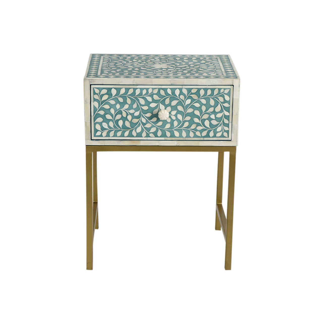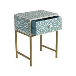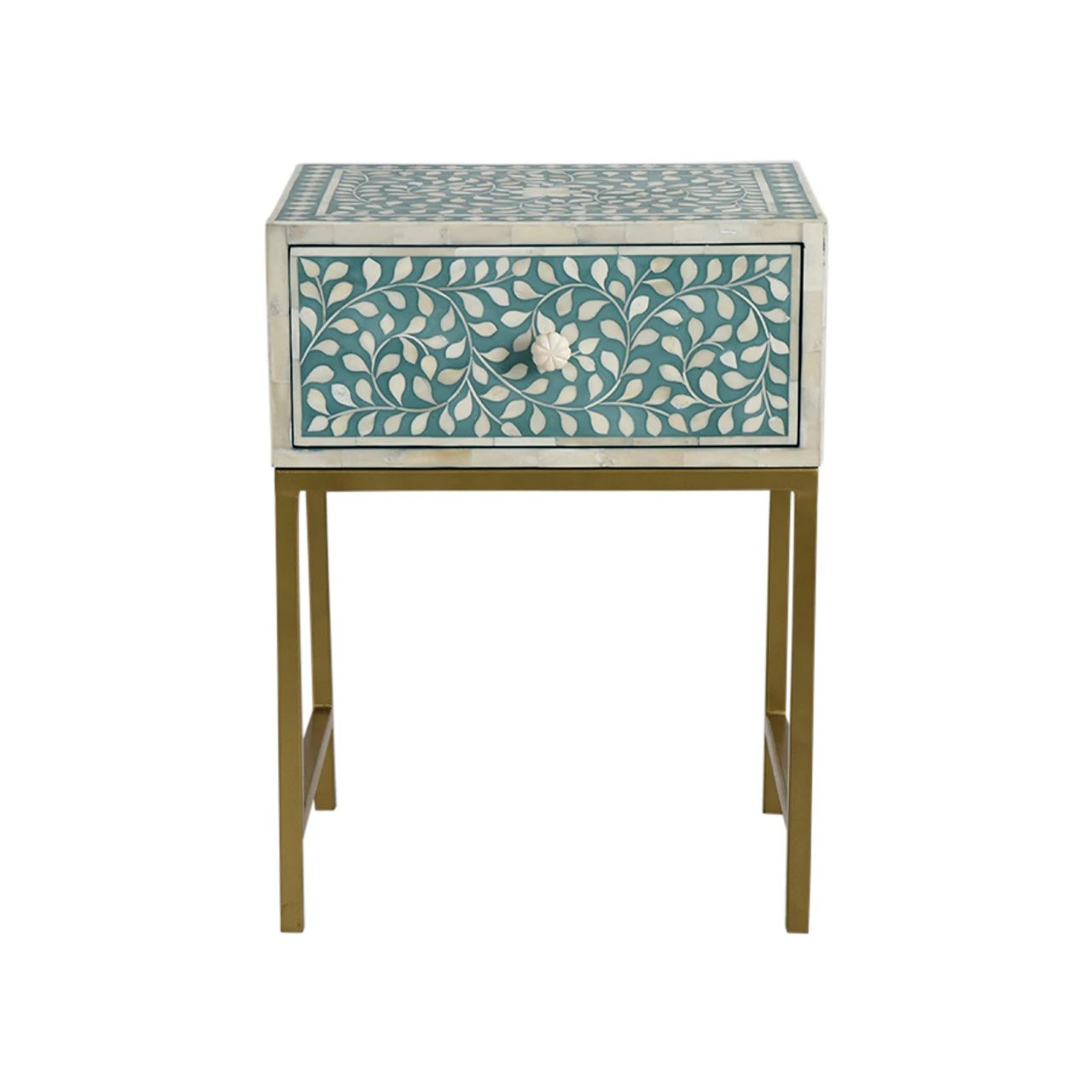 Handmade in India, this traditional teal and bone inlaid bedside table features a sweet floral motif and a brass polished metal stand. It would be just perfect by the bed or living room.
