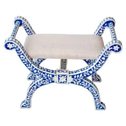 Traditional in design yet modern in appeal, this Roman stool, handmade in India, features a floral bone-inlaid pattern and works beautifully at the foot of the bed, as additional living room seating or as a powder room accent.