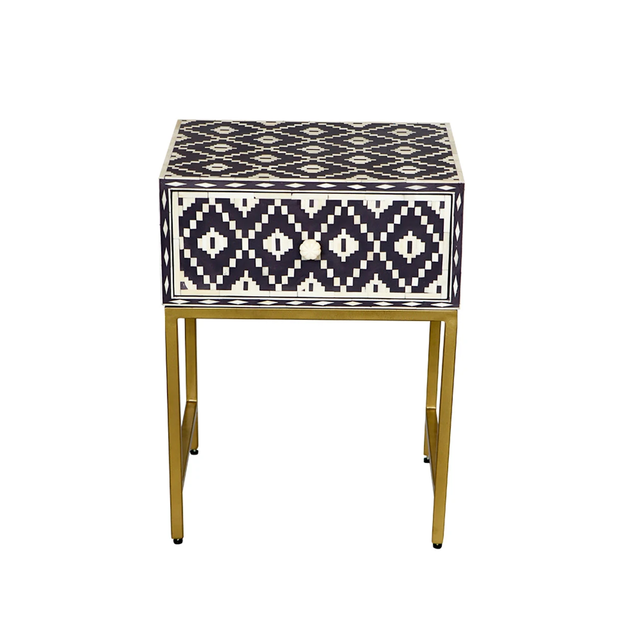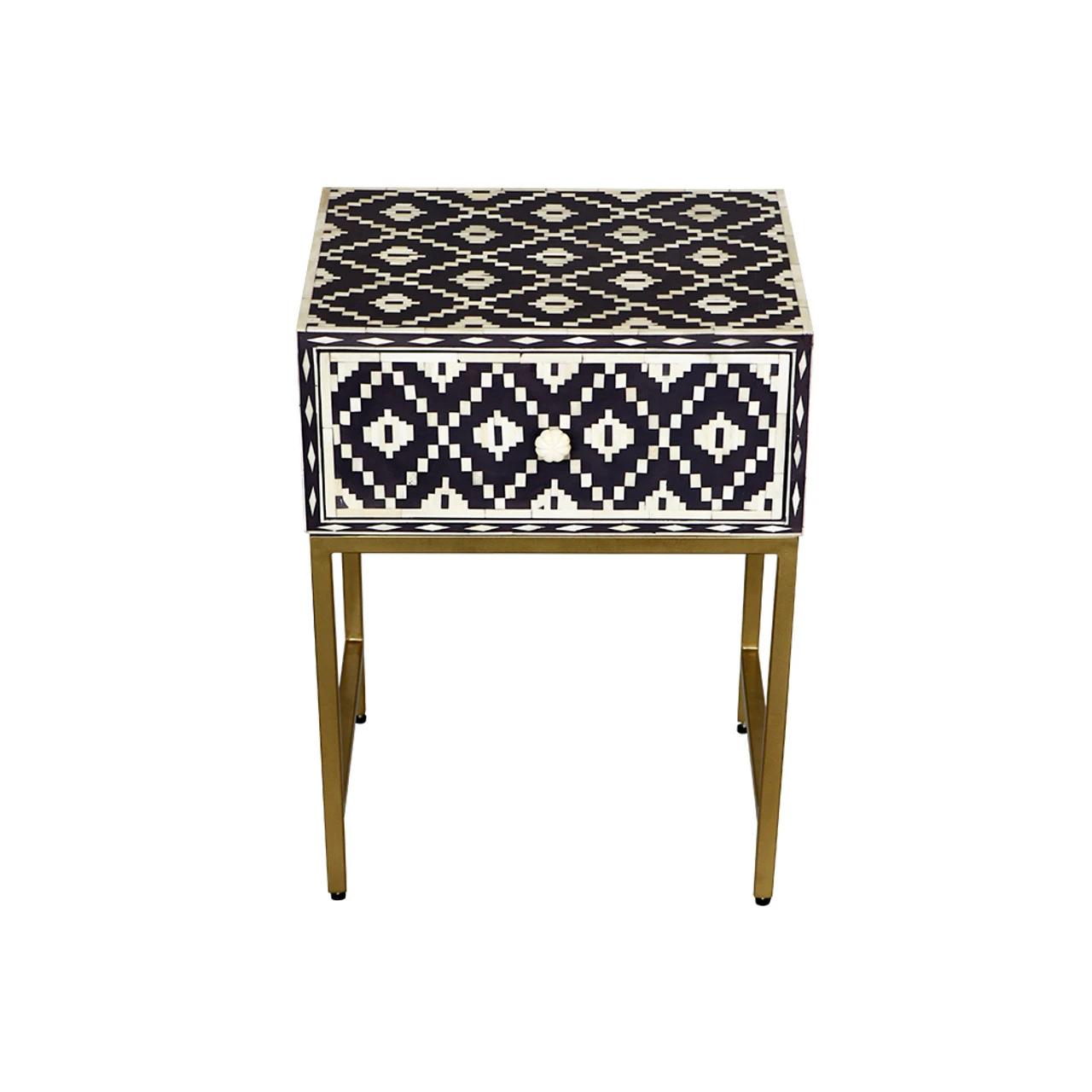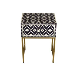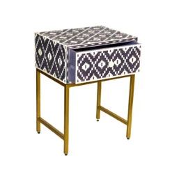 Handmade in India, this traditional Blackberry and bone inlaid bedside table features a sweet Ikat motif and a brass polished metal stand. It would be just perfect by the bed or living room.