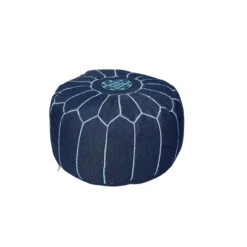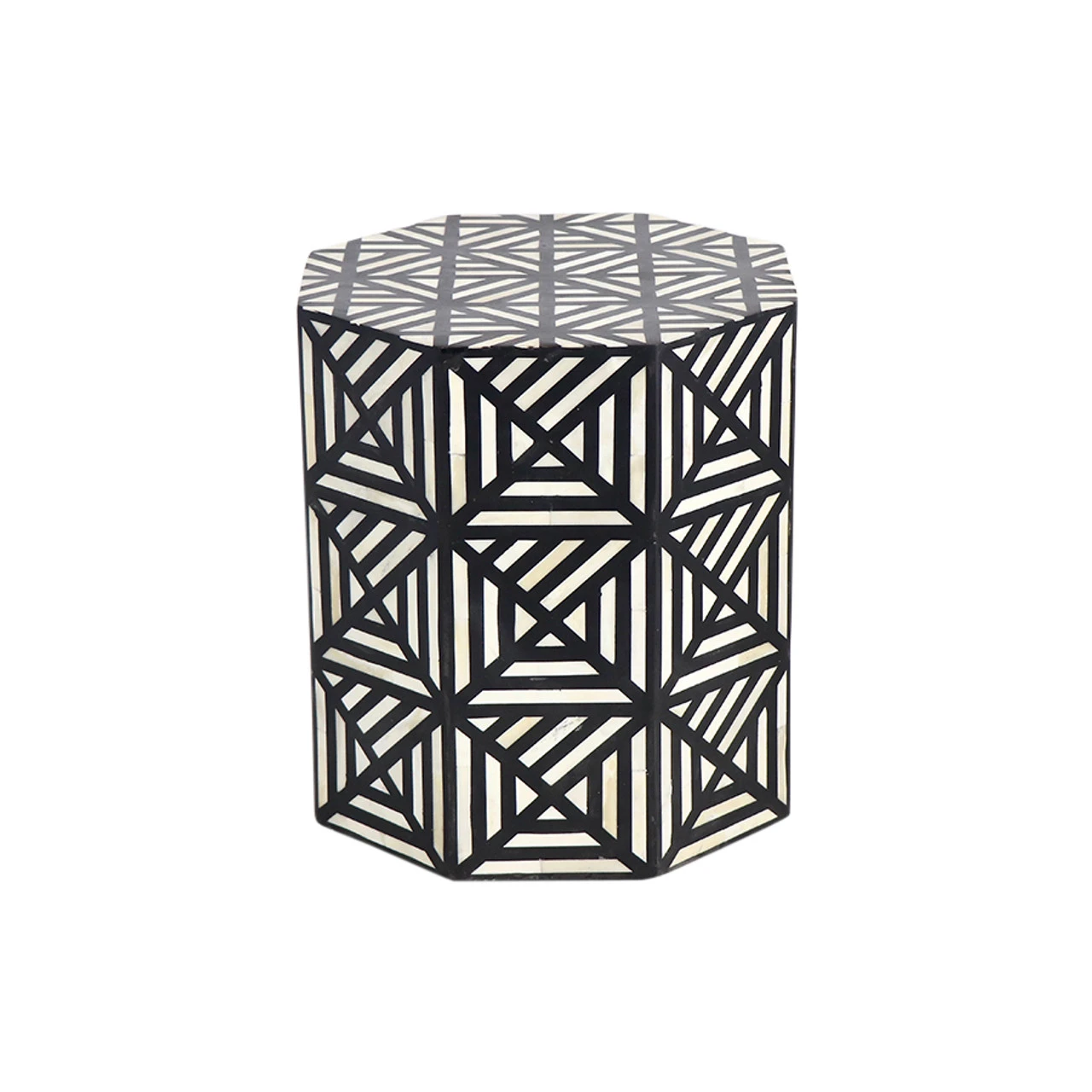 The traditional drum table gets a contemporary twist with a bold geometric pattern and blue hue. Crafted of mango wood and bone inlay, this piece, handmade in India, can be used as a bedside table, additional seating or side table.Â