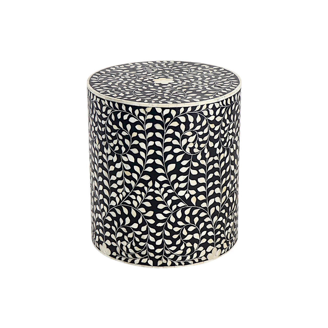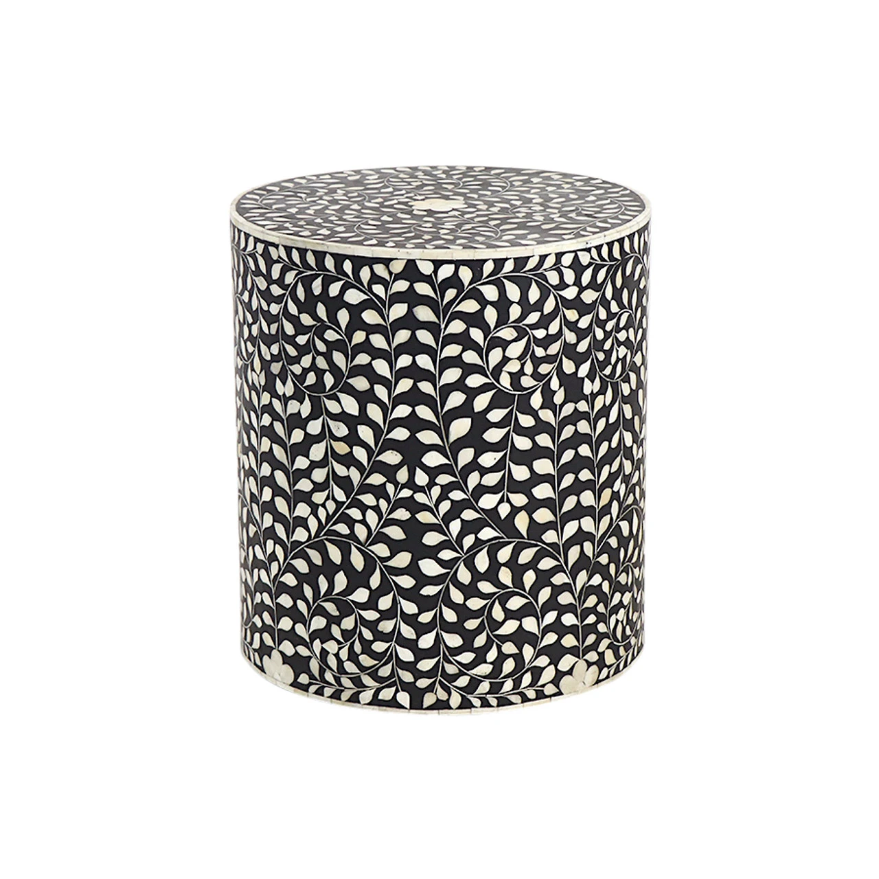 The traditional drum table gets a contemporary twist with a bold floral pattern and black hue. Crafted of fiberboard wood and bone inlay, this piece, handmade in India, can be used as a bedside table, additional seating, or side table.