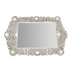 Create striking impact in the hallway, bedroom or bathroom with this handmade bone-inlaid mirror. Features an elegant floral design set in black. The mirror can be hung either vertically or horizontally, and will work in many places throughout the home. Each of our bone-inlaid pieces was carefully crafted by hand, creating variations that make each piece unique.