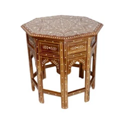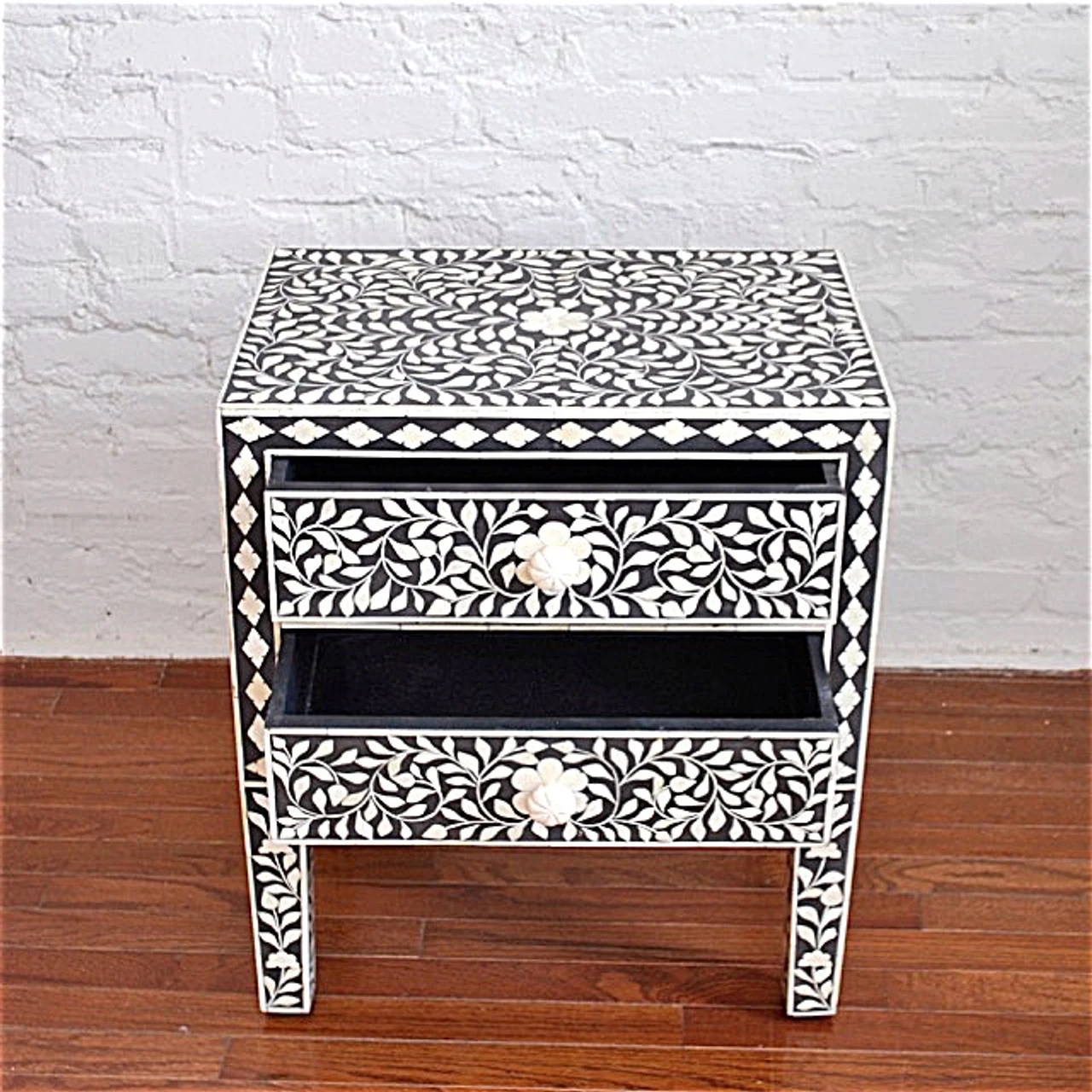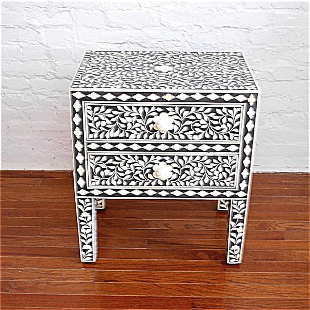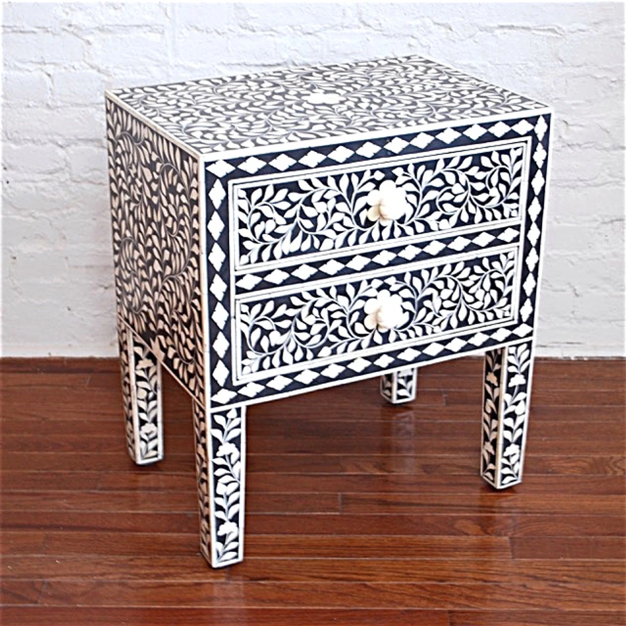 A beautiful addition to any bedroom or bathroom, this two-drawer bone-inlaid table features a feminine floral pattern. Available in various colors, tables are made from wood, resin and buffalo bone