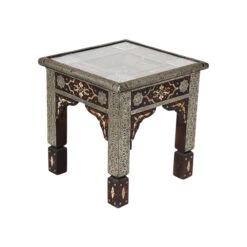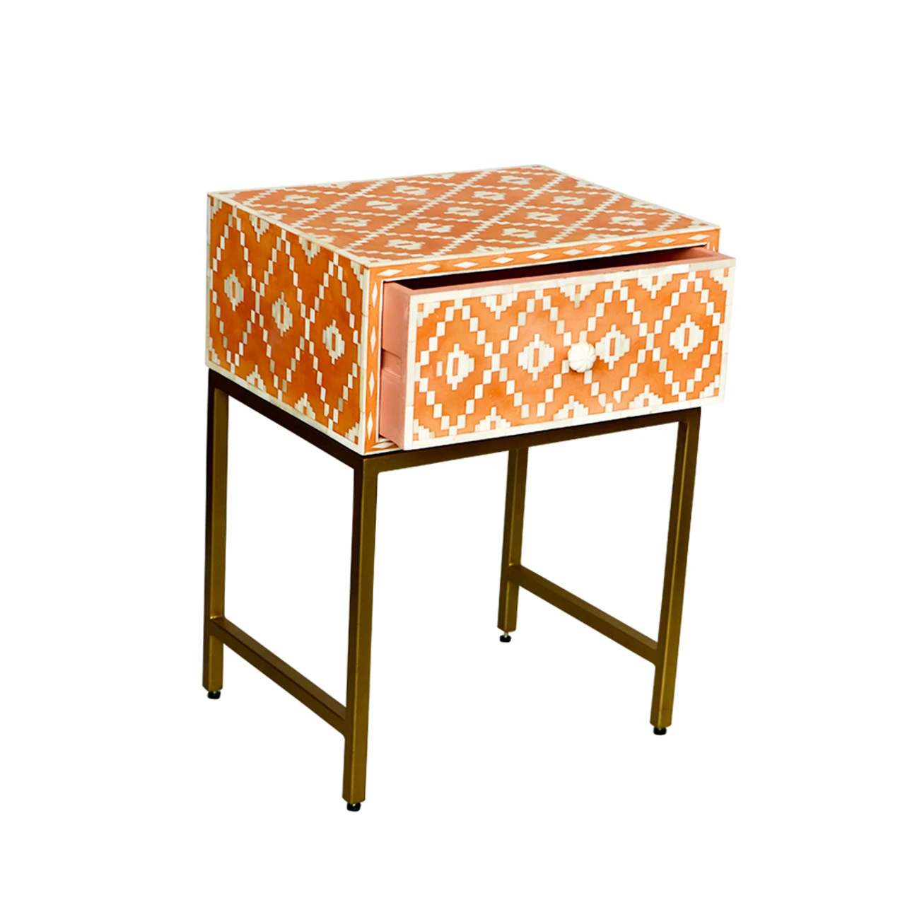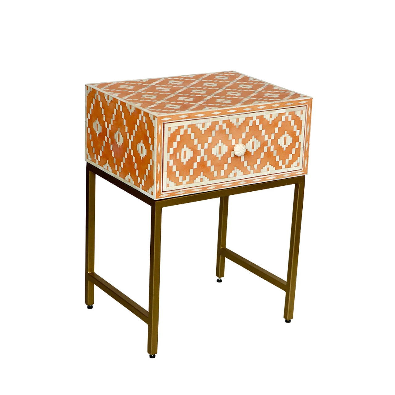 Handmade in India, this traditional blue and bone inlaid bedside table features a sweet Ikat motif and a brass polished metal stand. It would be just perfect by the bed or living room.