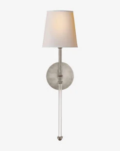 With a streamlined design, the Camille Sconce blends materials in your choice of several elegant finishes. Its linen shade is complemented by a metal and glass tail, bringing unique beauty and warm light to your space.