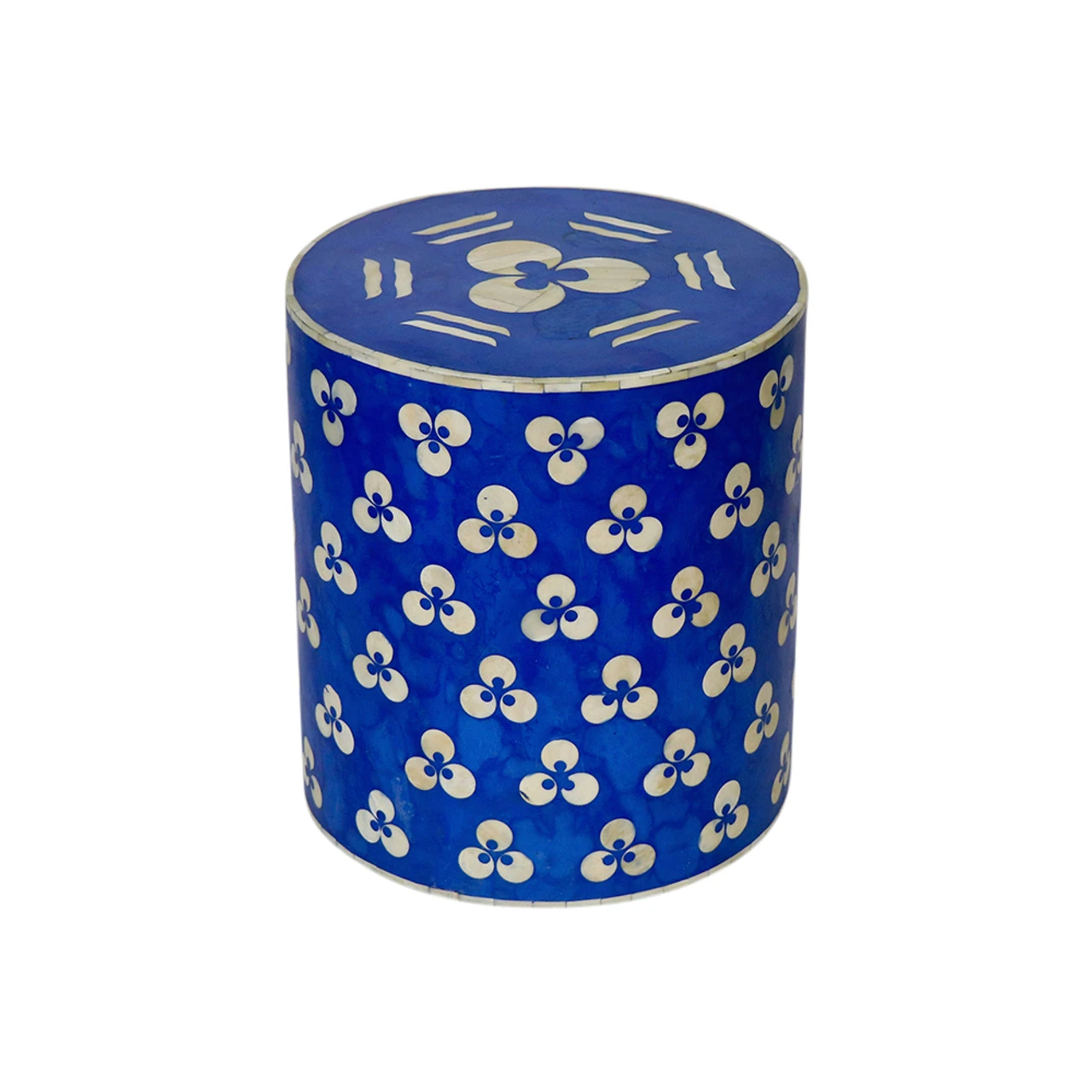 Contemporary and functional, this Chintamani drum stool features a bone-inlaid, floral pattern on medium-density fiberboard. Ideal for a side table, nightstand, stool or decorative piece.