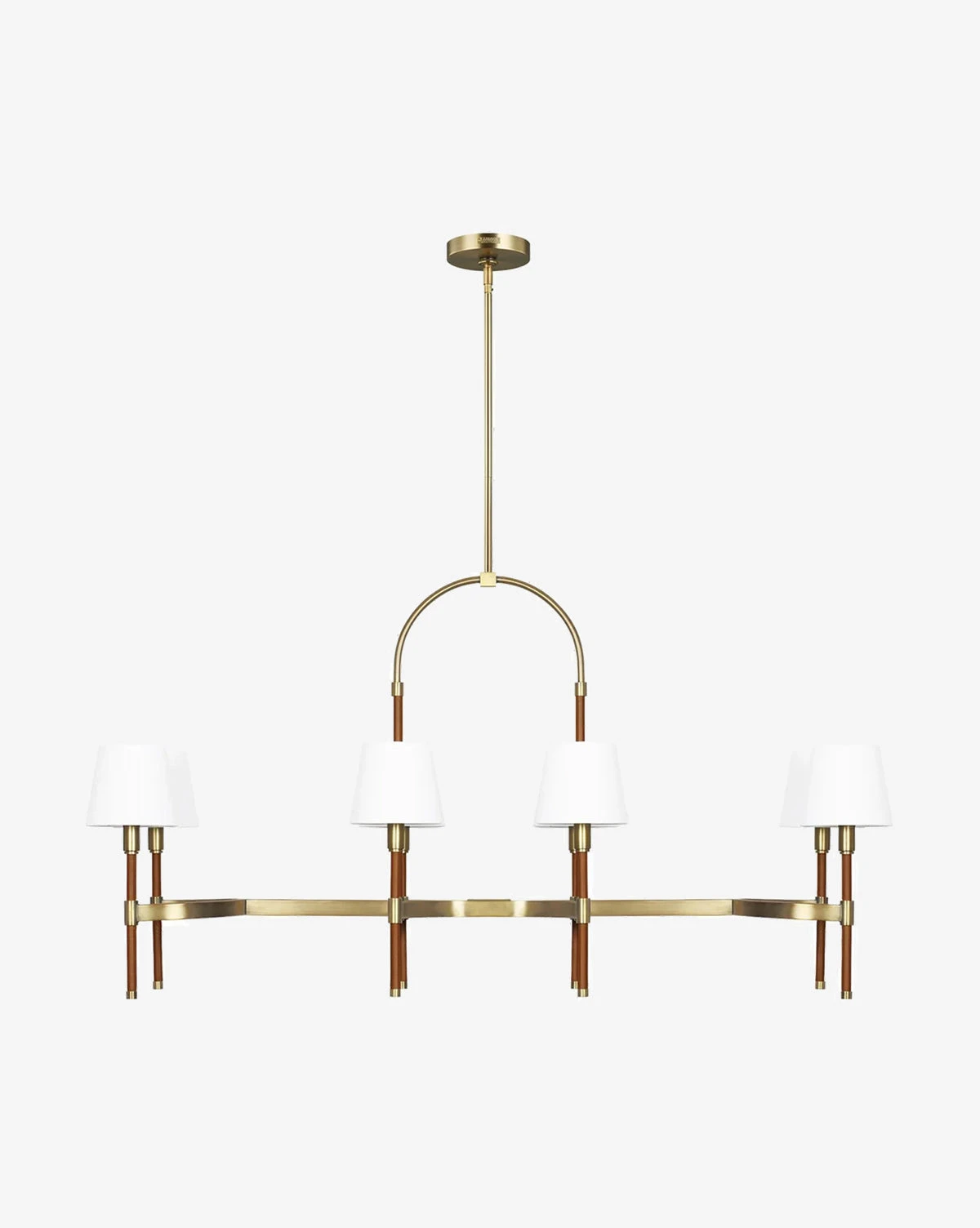 Mixed materials add a unique, refined element to the unusual shape of our Danica Linear Chandelier. With a base finished in either a time worn brass leather details in a rich cognac or solid black accent the sophisticated silhouette, elevating your dining table or even kitchen island to a new level.