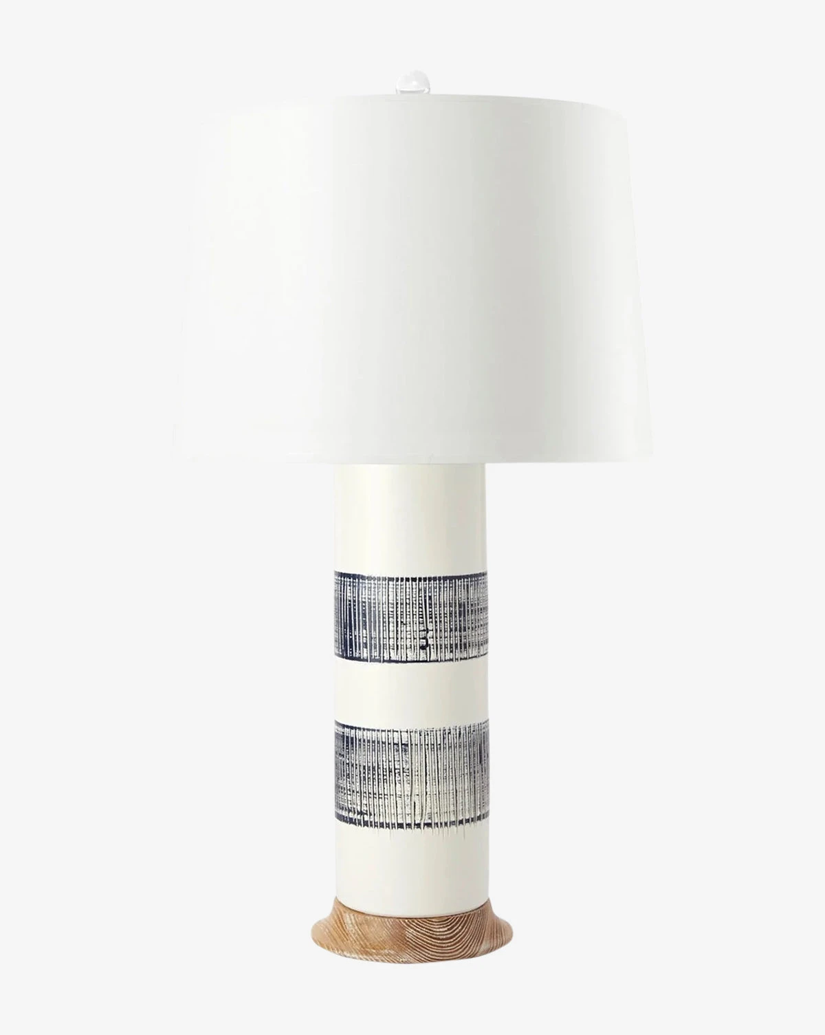 With two bands of hand-carved lines, brushed with navy paint, Our Elena Table Lamp transforms an otherwise simple column lamp. Together with its cerused oak base, it carries subtle coastal vibes to your home.