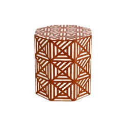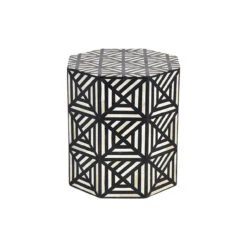 The traditional drum table gets a contemporary twist with a bold geometric pattern and brown hue. Crafted of mango wood and bone inlay, this piece, handmade in India, can be used as a bedside table, additional seating or side table.Â