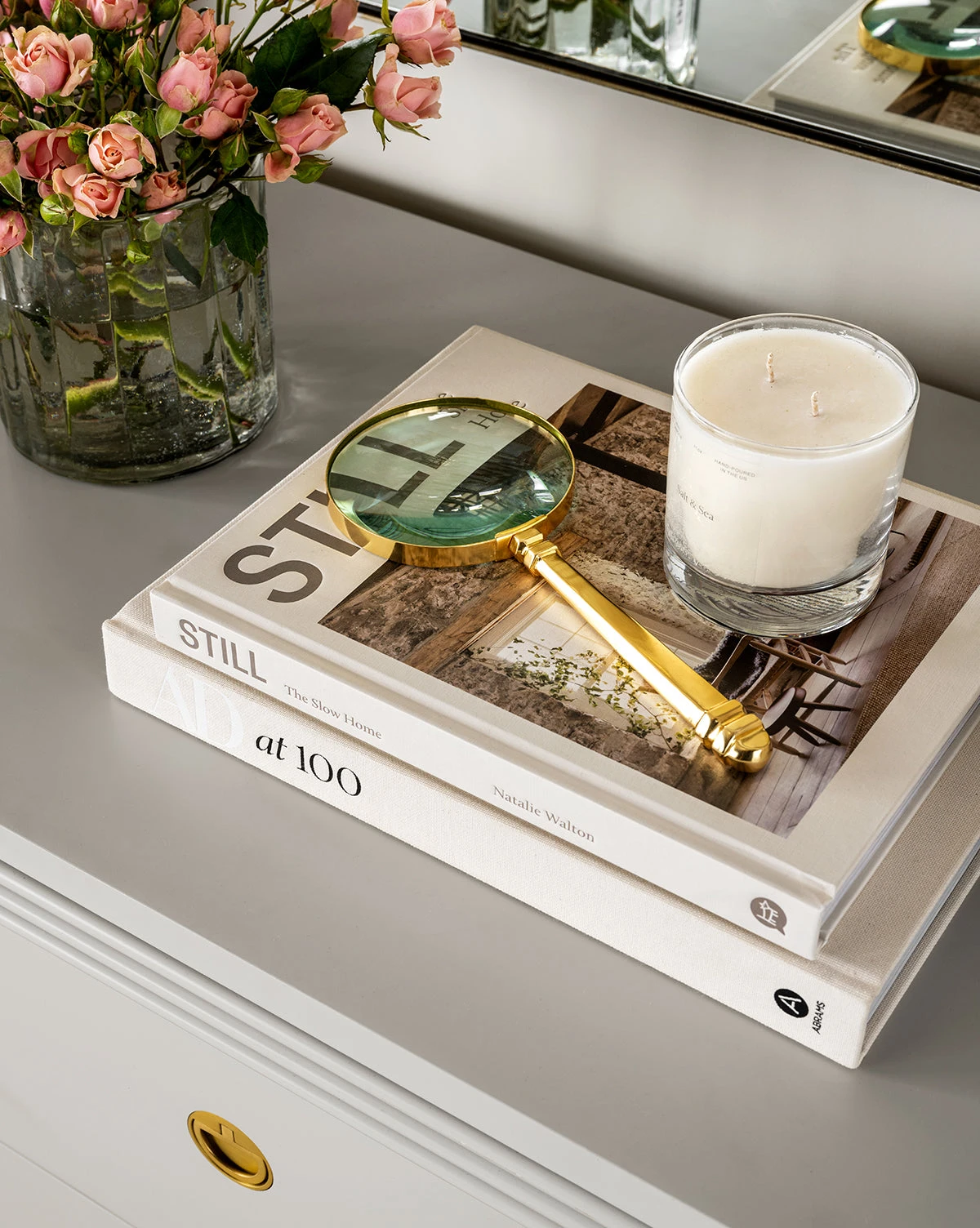 Both elegant and eye-catching, the Gerard Brass Magnifying Glass is made from solid brass surrounding the looking glass. The sleek materials together give this accessory a vintage feel, perfect for adding a refined detail to a desk or vignette.