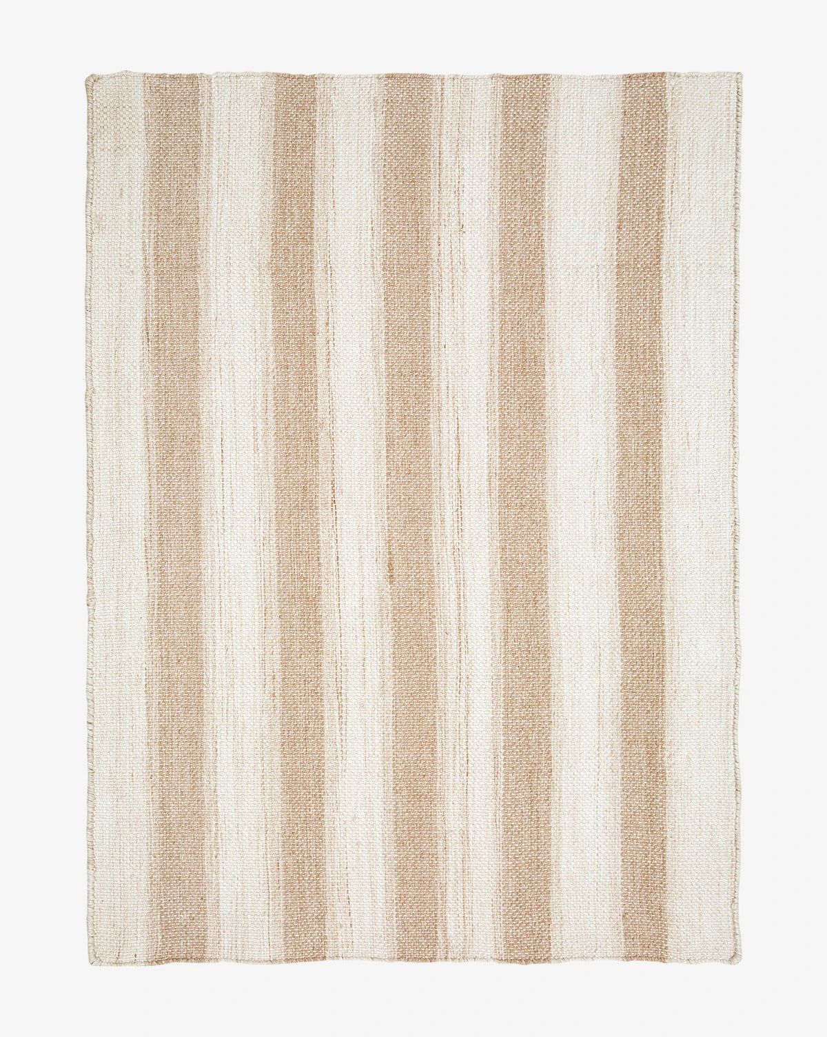 Entirely handwoven, the Goldie Handwoven Indoor/Outdoor Rug is soft underfoot with a durable construction of 100% PET. In a palette of tan and cream, its classic stripe pattern feels approachable and playful, and its color scheme is neutral and warm.