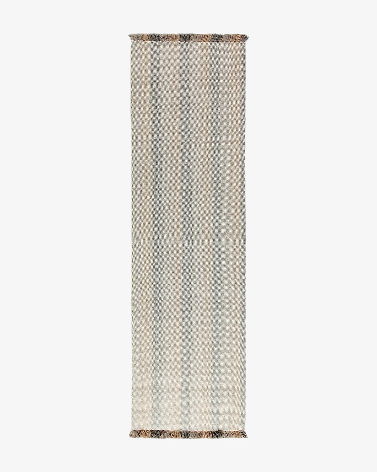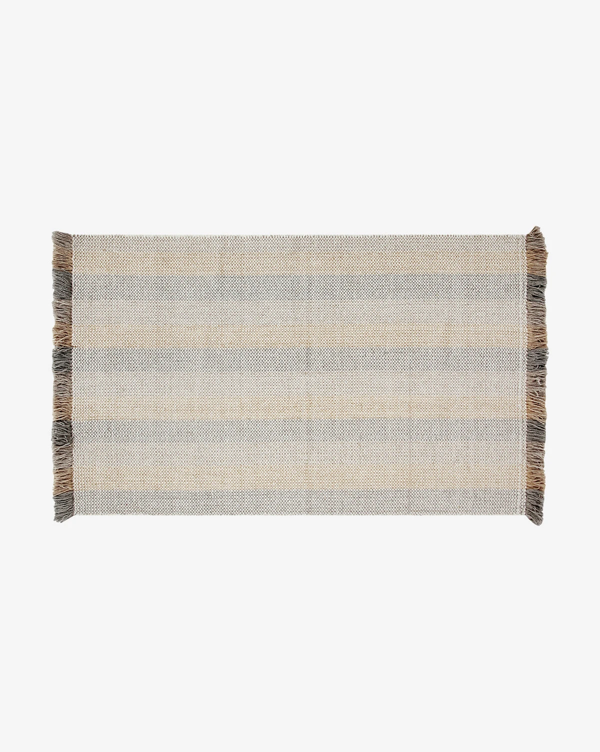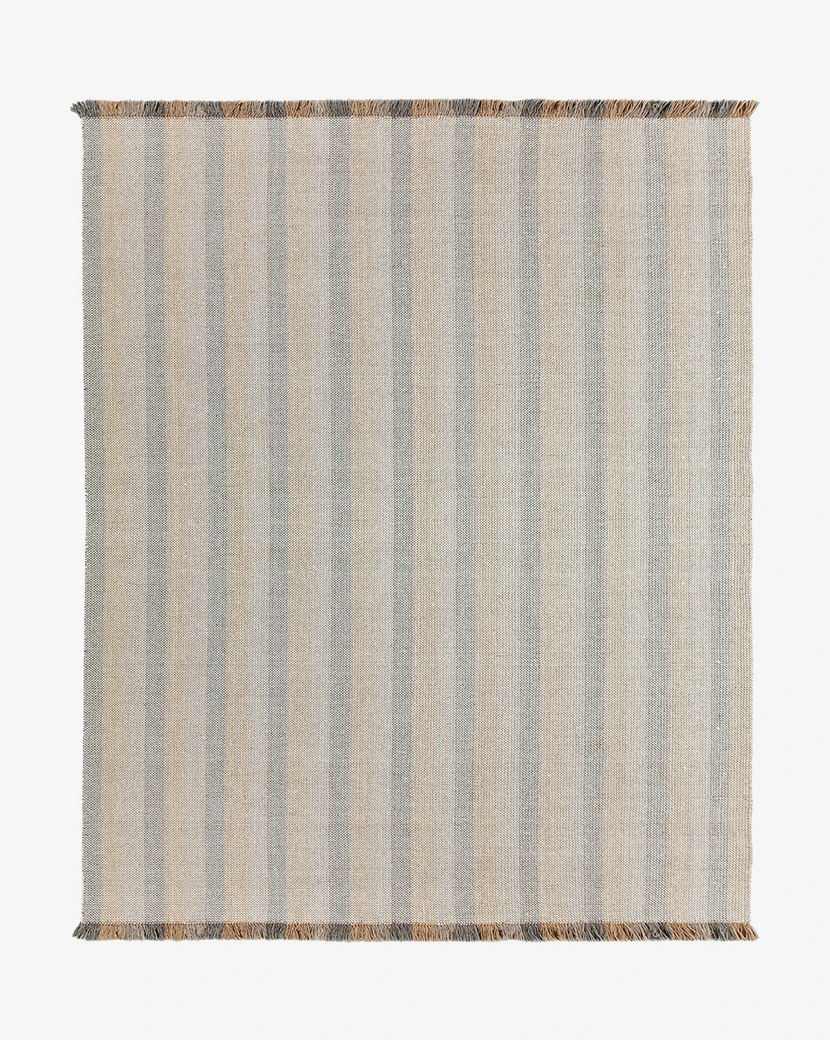Contrasted tones bring a playful quality to our eclectic Grandby Handwoven Wool Rug. In hazy, muted hues of rose, beige, and gray-toned brown, the rug itself has a handwoven striped design with fringe that extends this pattern in brighter, richer tones of the same palette.Â