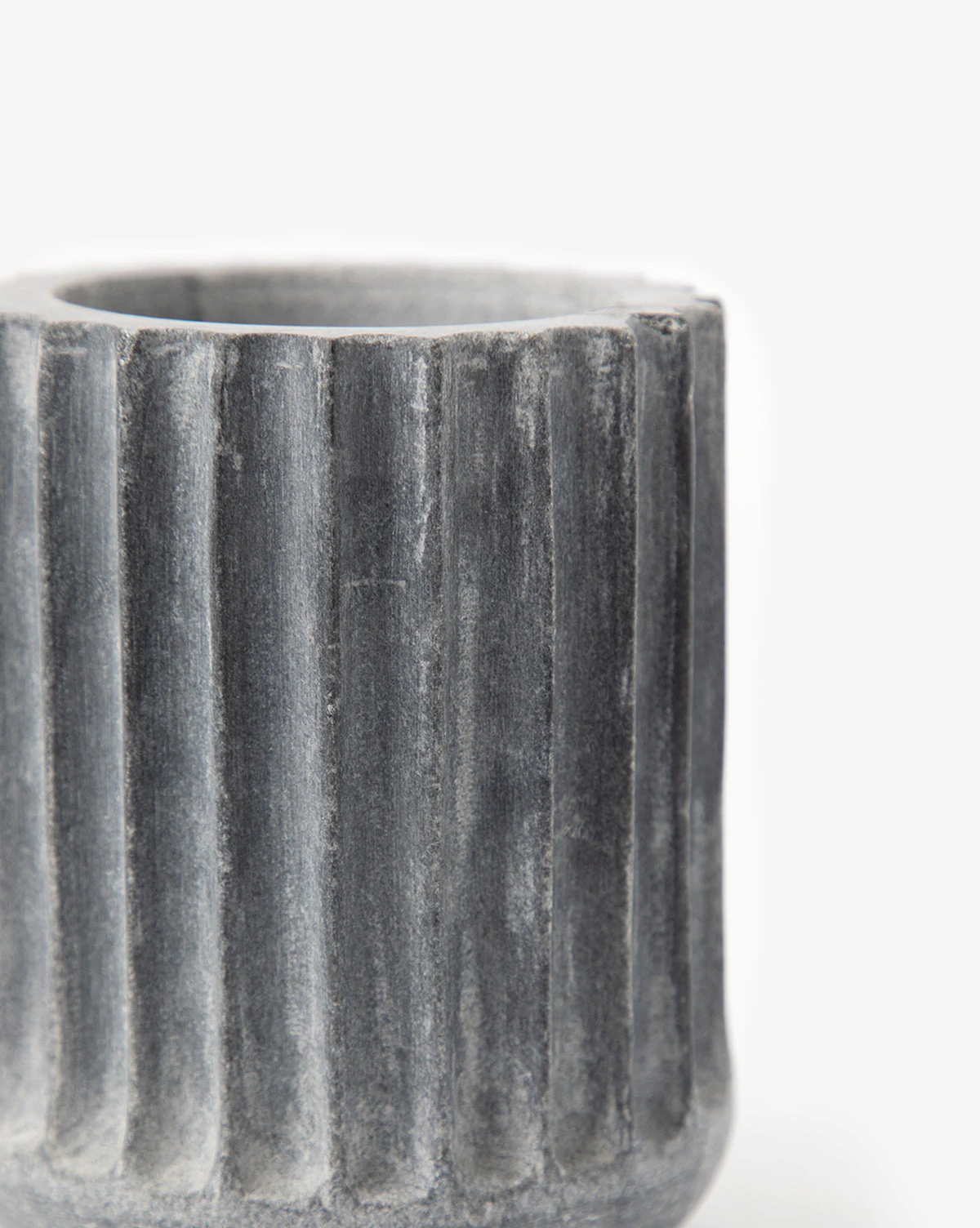 Crafted from Selewara marble, the Grayson Black Marble Vase has a moody and vintage feel. Its short shape is complemented by the vertical divots on its round wall, bringing elevated texture and design to your vignettes.