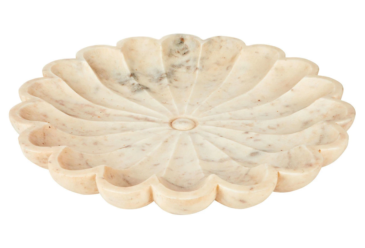 Beautifully hand carved lotus dish, sculpted from fine white marble. The marble plates are not polished, which gives a very raw and organic texture.