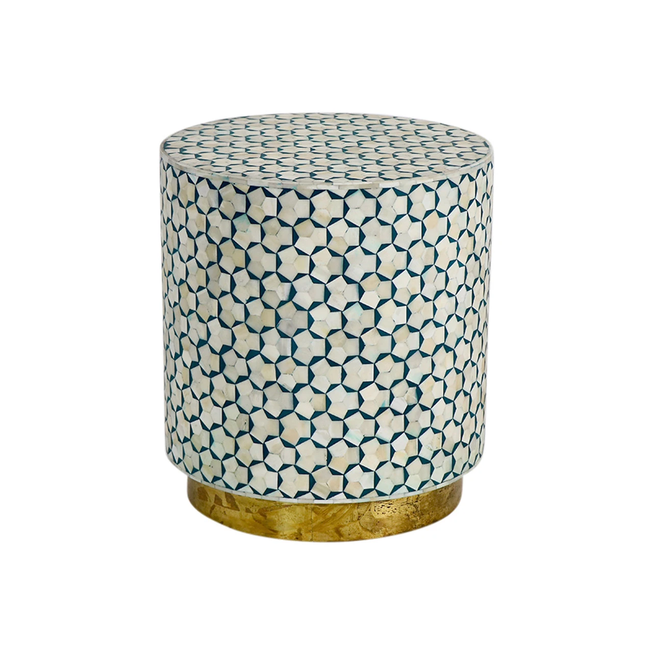 The classic drum table gets a contemporary update with this bone-inlaid piece featuring a brass-brushed base and geometric pattern.