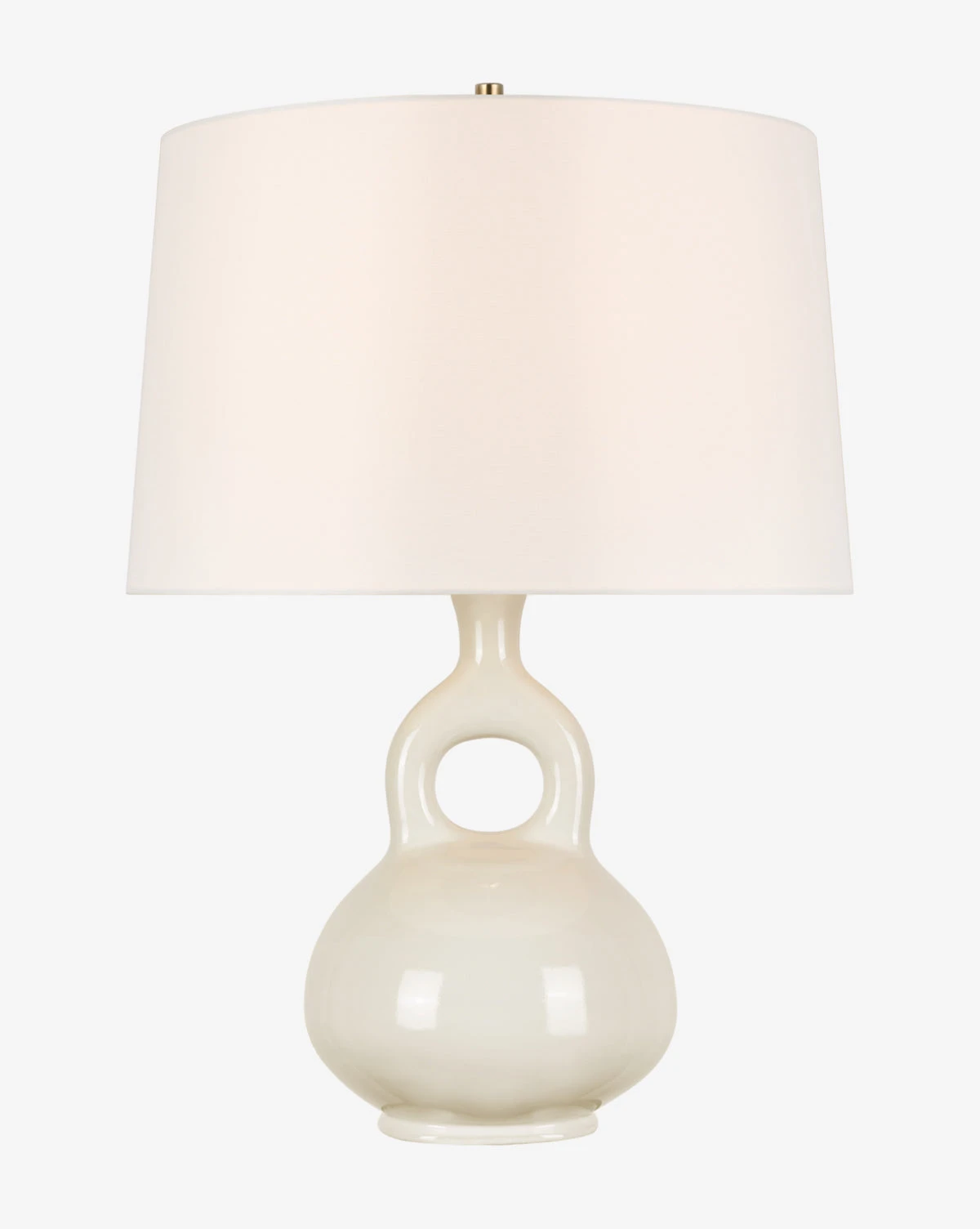 An abstract modern base brings a sculptural element to your space with the Lamu Table Lamp. Crafted from glazed ceramic in either a mixed blue and brown or an ivory finish, the wide linen shade complements the intricate structure of the lamp and provides a functional accent piece for a console or side table.