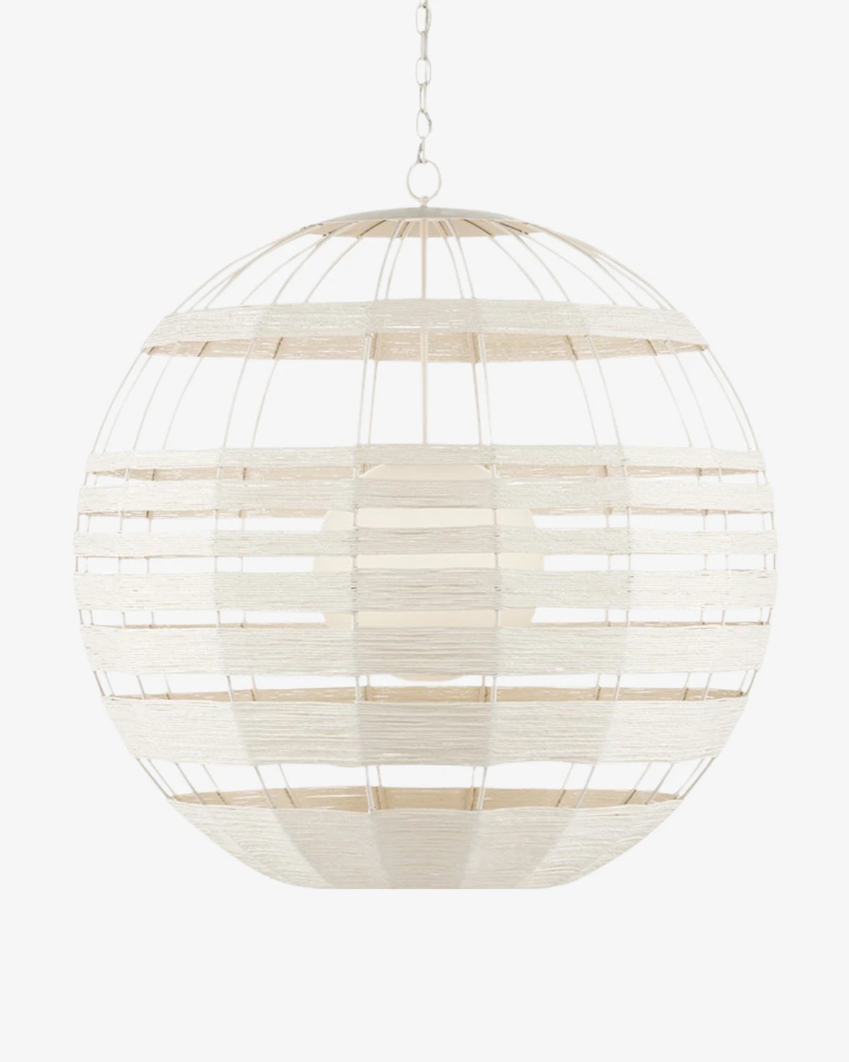 Bringing even and warm light to your entryway or dining room, the Lapsley Orb Chandelier is crafted from a unique mix of materials. From the bands of twisted paper twine that intersect the white-finished wrought iron structure around the frosted glass globe, this chandelier lends eclectic style to your home design.