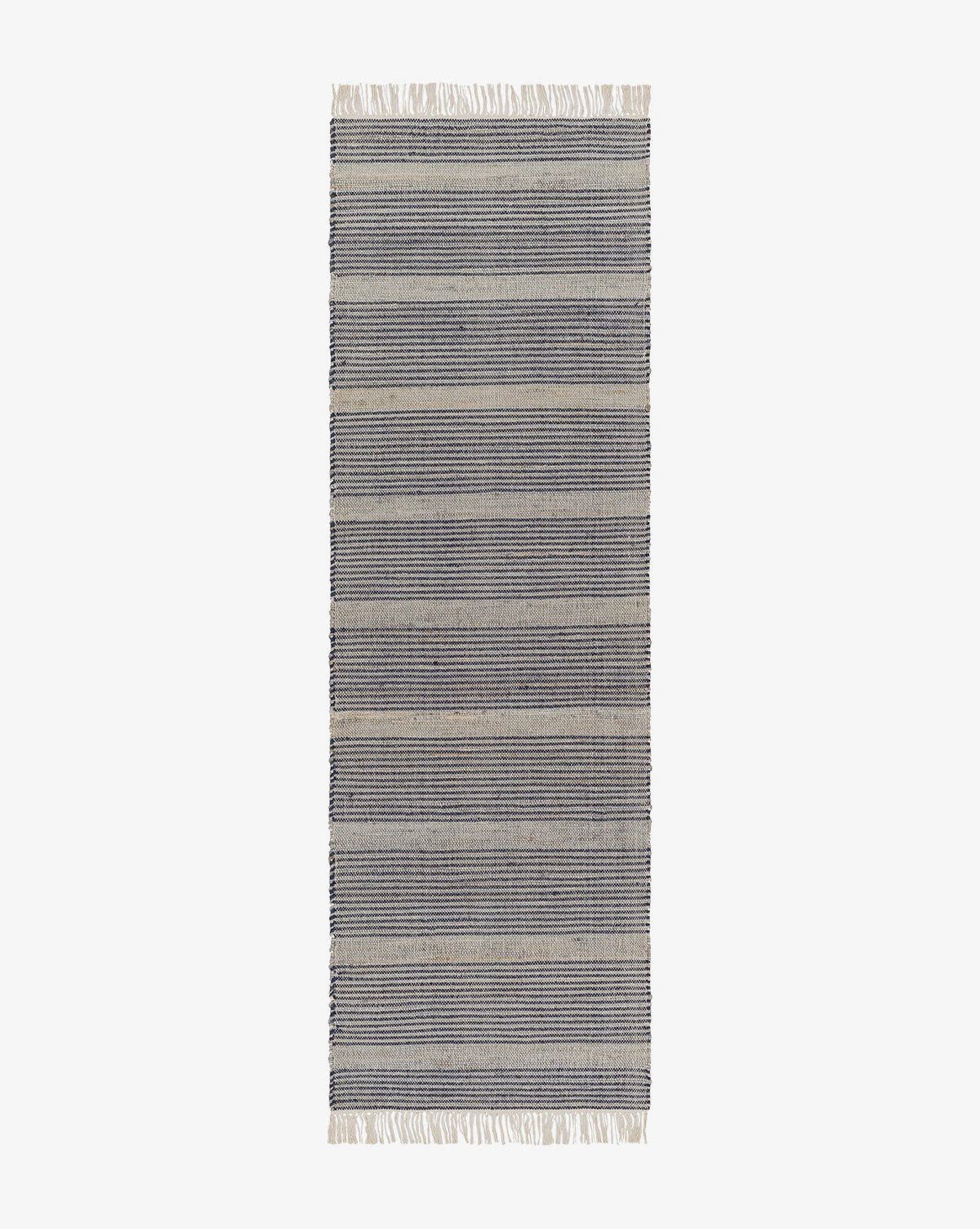 With an organic feel, the Mayon Navy Handwoven Rug brings both texture and dimension to your space. Made from a blend of jute and cotton, the striped motif of this rug is simple yet sophisticated, featuring navy, slate, and off-white tones.  Â