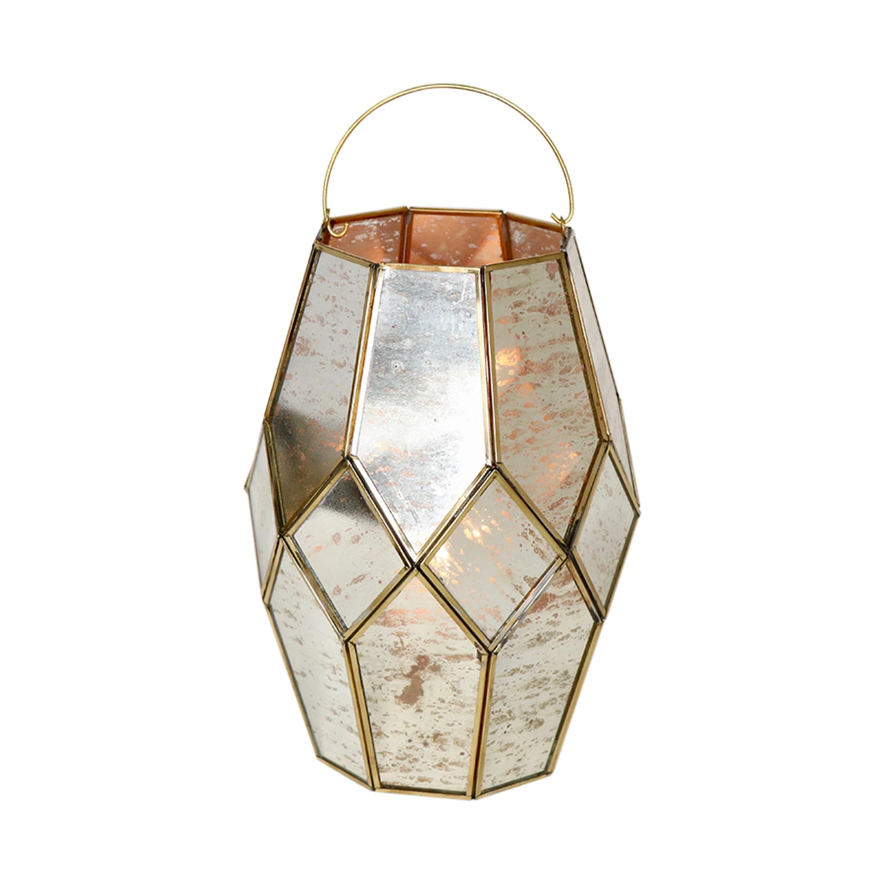 Add a little shine to your living space with these contemporary Mercury Glass Candle Lanterns. Crafted of Silver Mercury Glass inside individual metal panes. this candleholder is both modern and glamorous with Hollywood Regency feel to it.