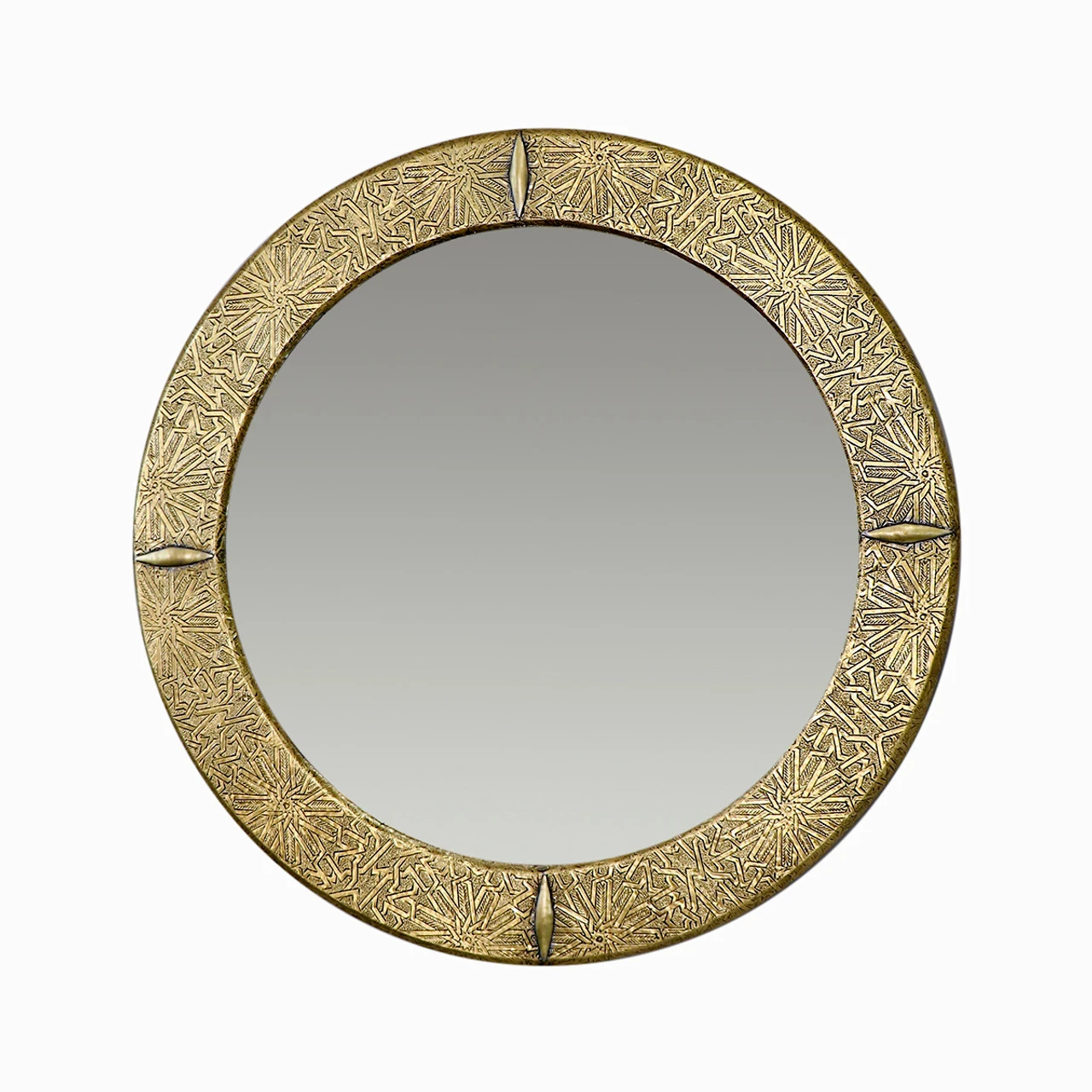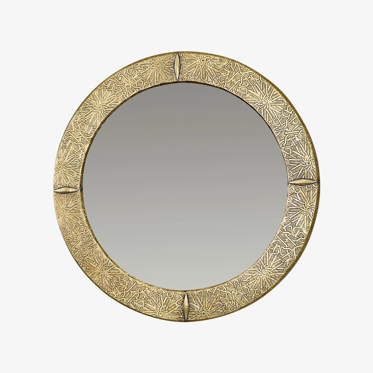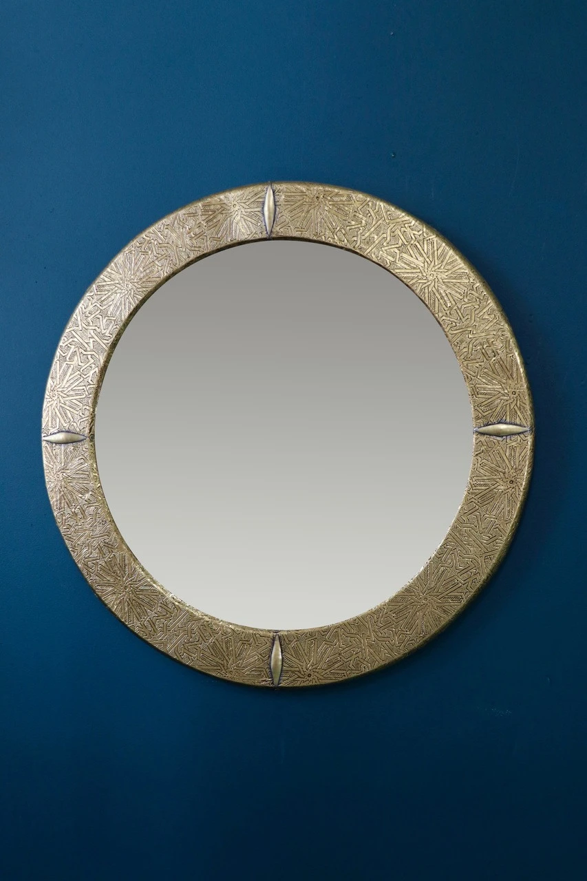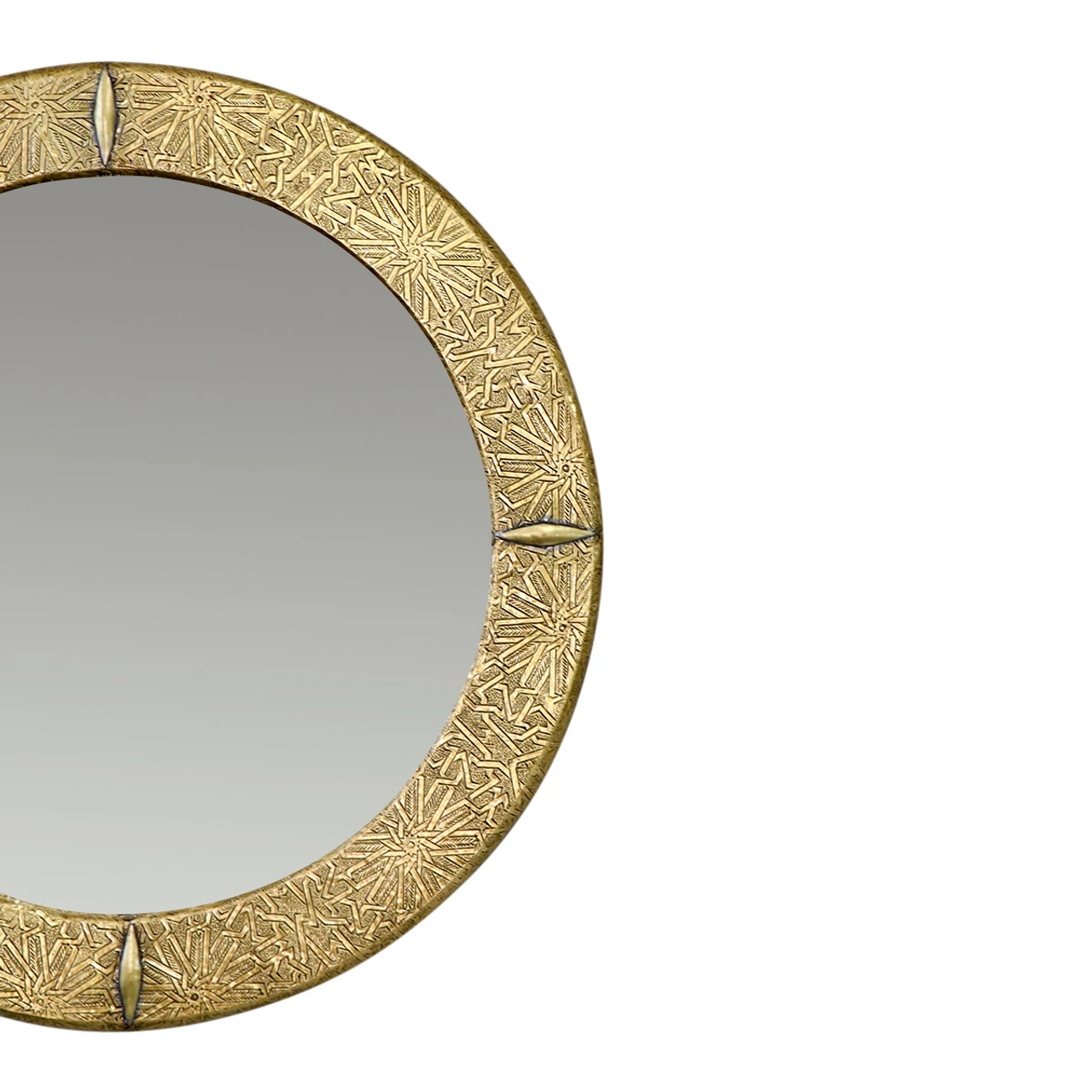 Moroccan brass metal round mirror, characterized by its luxurious golden sheen and intricate embossed arabesque patterns that cover the wood frame, features motifs that are likely traditional in Moroccan design. This piece would be a focal point in any living room, bedroom, or bathroom, adding both cultural depth and a touch of Moroccan flair to any interiors.