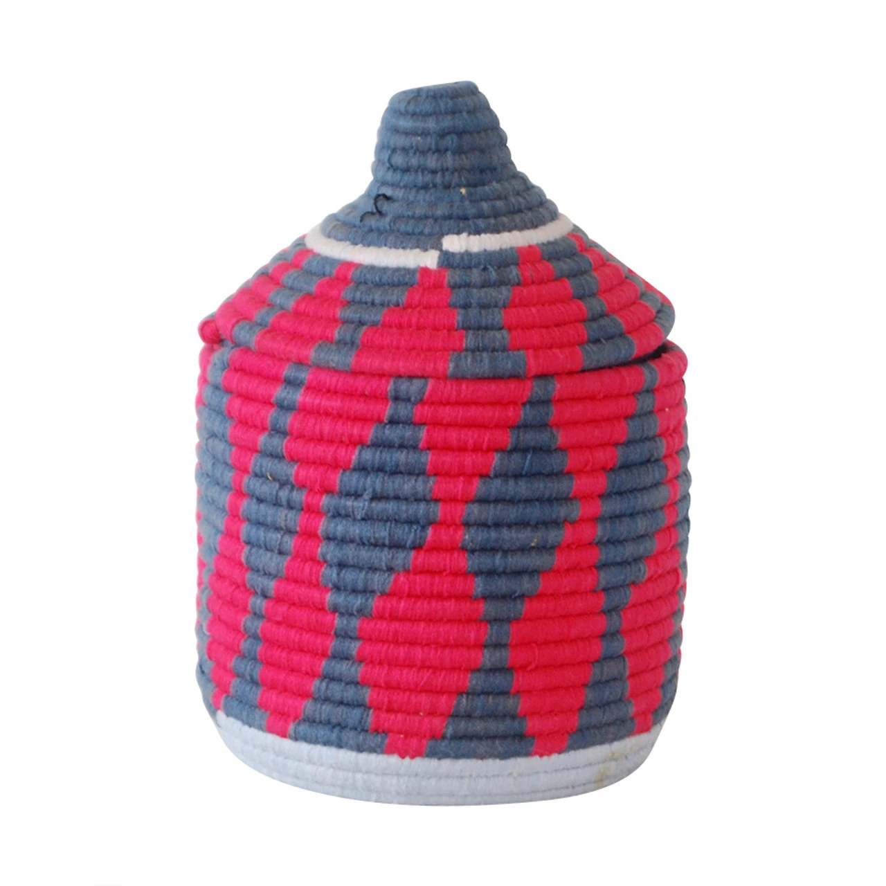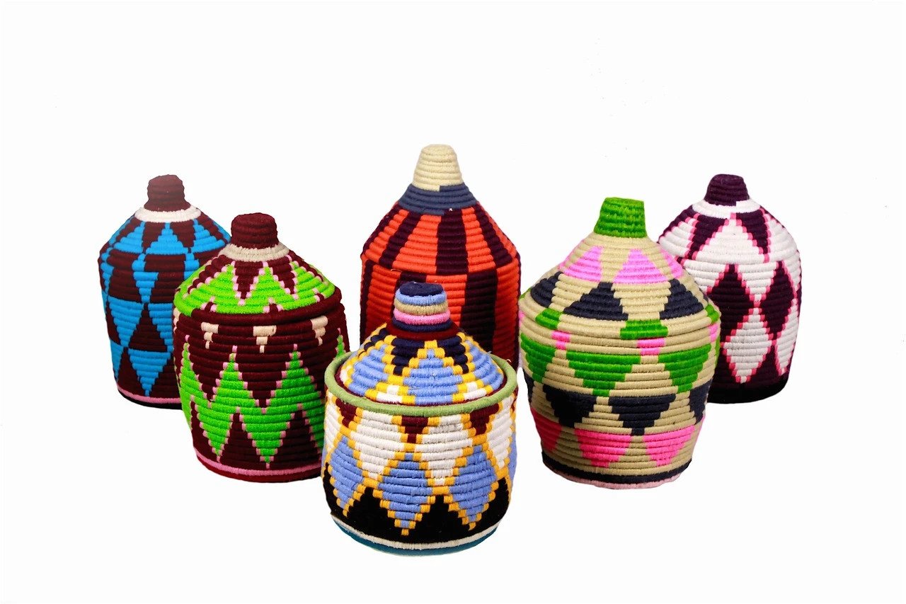 These traditional bread baskets are made in northern Morocco and feature bright colors and bold designs. Crafted from straw and wool, they can be used for décor, to keep jewelry or, as is their origin, to keep bread warm on the dining table.