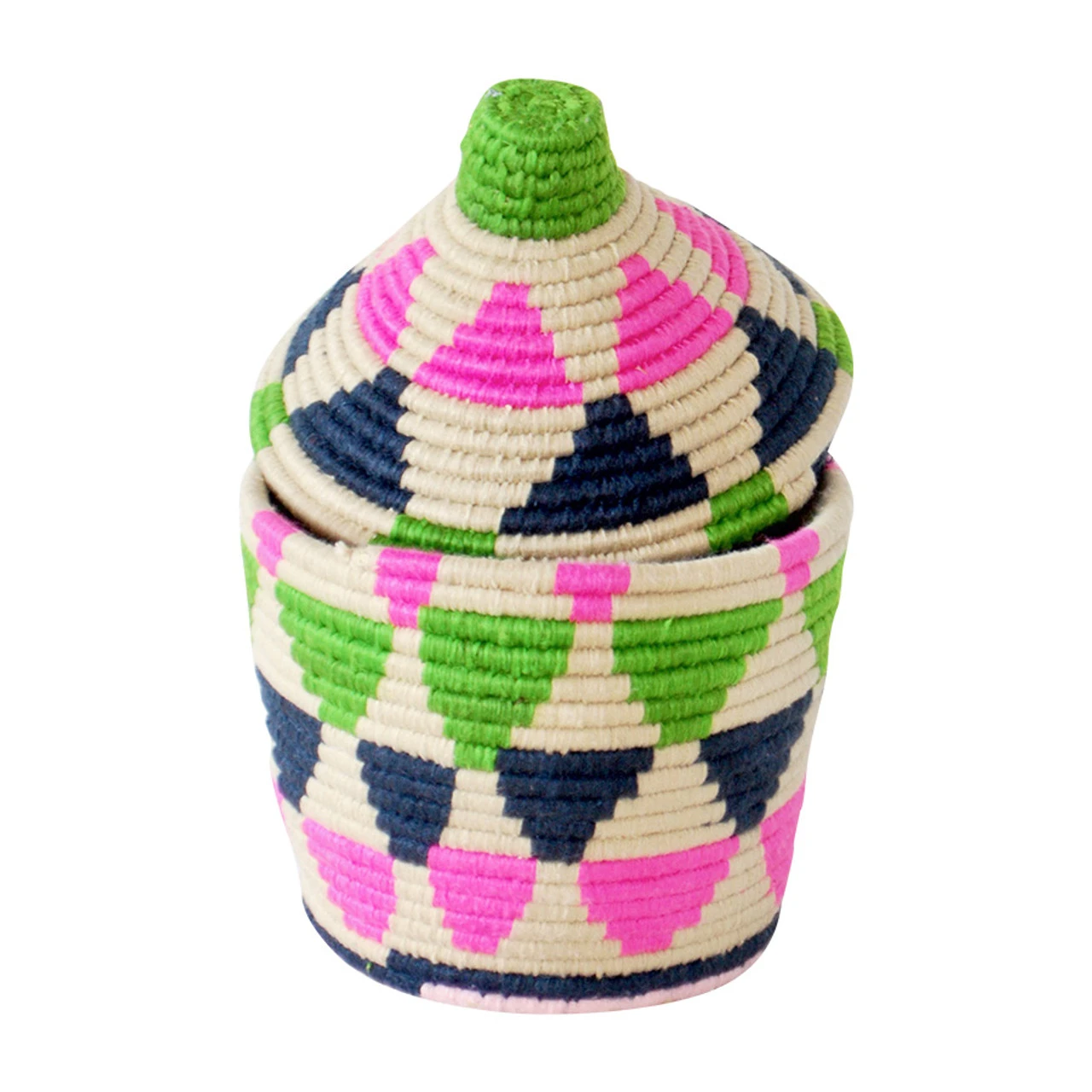 These traditional bread baskets are made in northern Morocco and feature bright colors and bold designs. Crafted from straw and wool, they can be used for décor, to keep jewelry or, as is their origin, to keep bread warm on the dining table.
