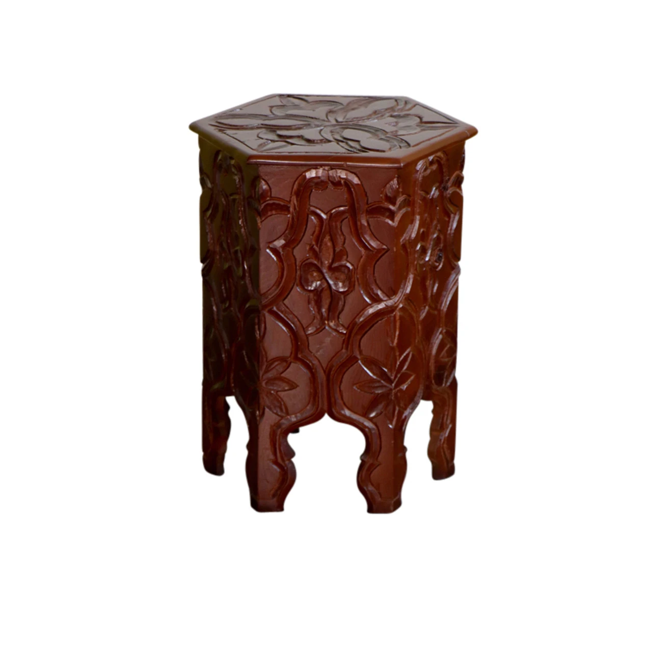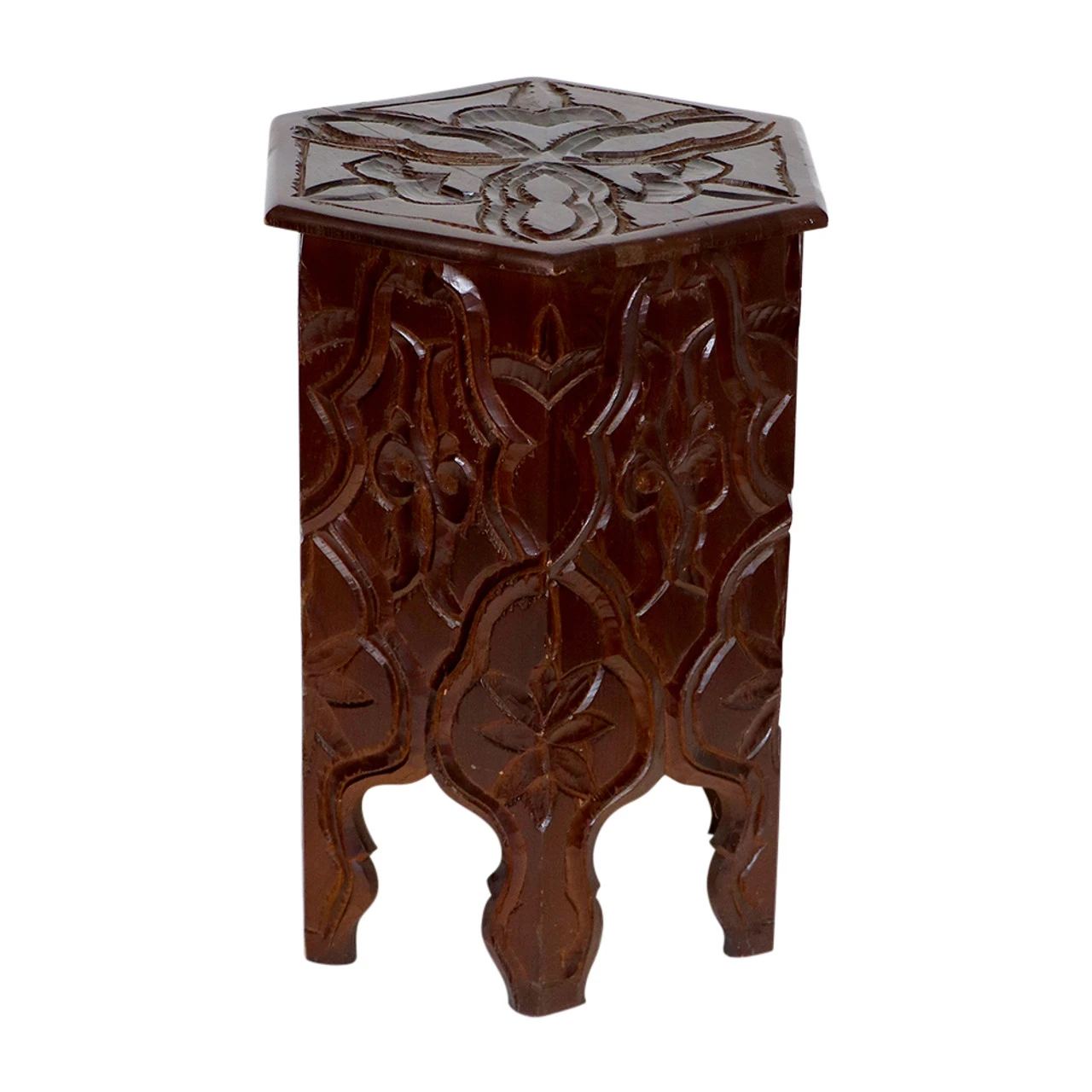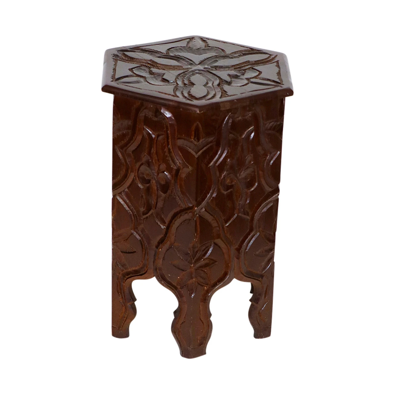 Regal and intricately carved by hand, this Moroccan wooden side table can be the centerpiece of your seating area or used to showcase beautiful decorative objects.Â