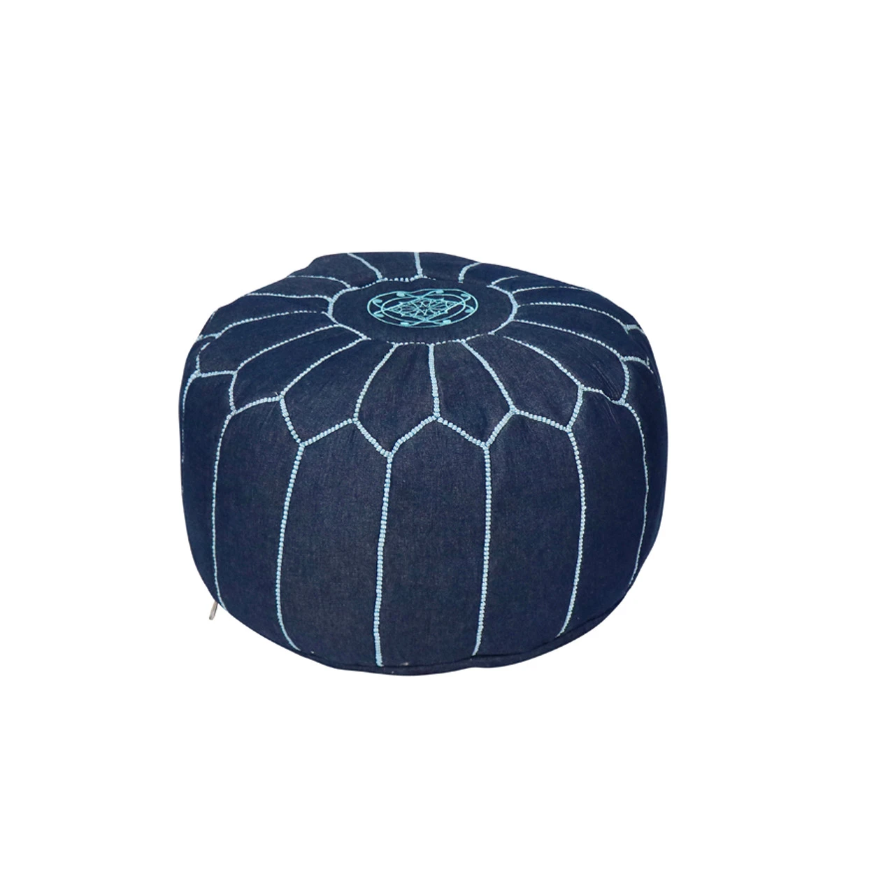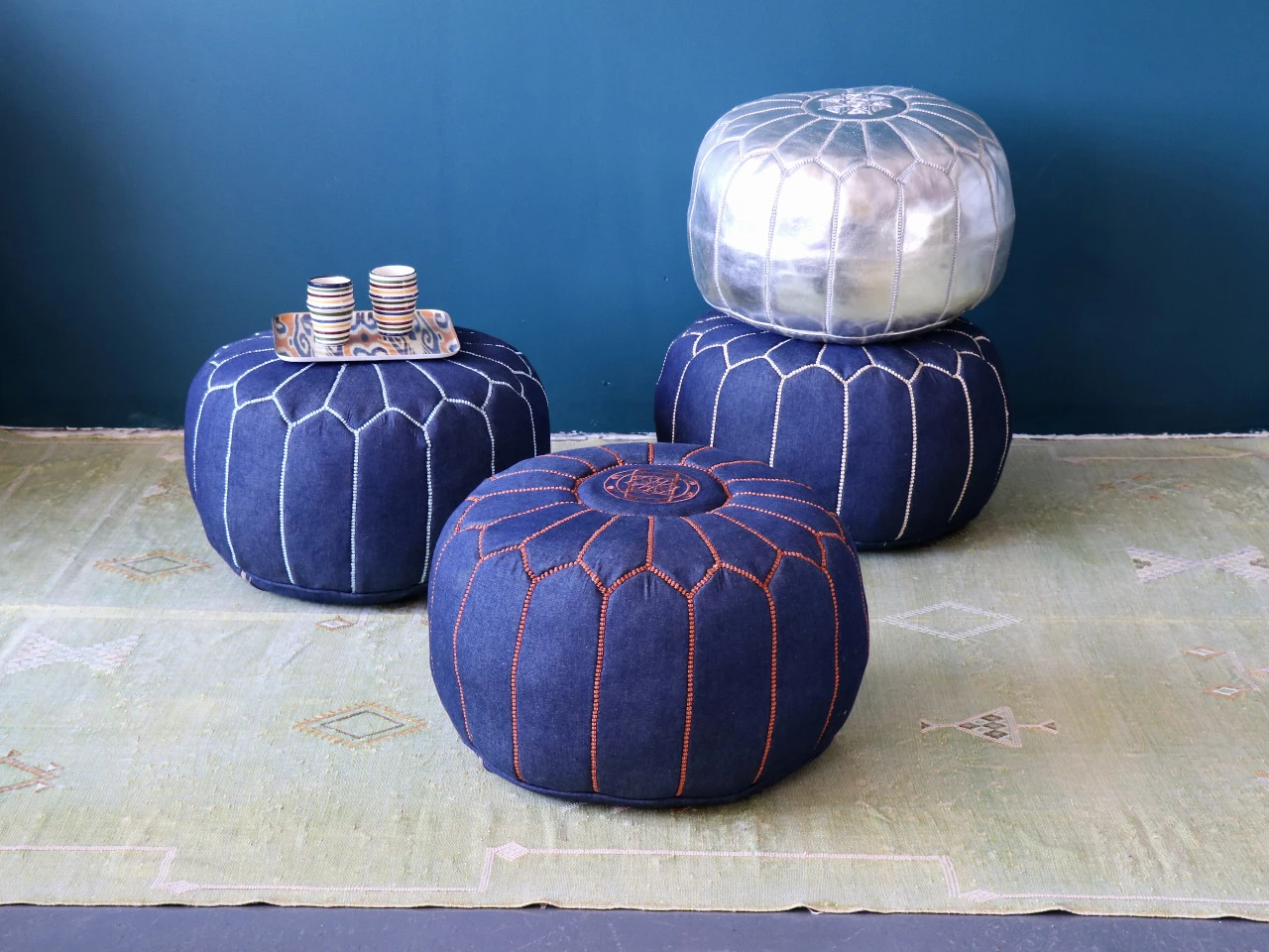 This Moroccan Denim and leather pouf is a multifunctional and comfortable addition to your living room décor. Navy blue Denim leather with a detailed geometric star pattern in the center, is sure to be an eye catcher yet with a simple contemporary feel to it. Whether is used as pouf, ottoman, hassock or chair to relax in, the extra seating option will come in handy when you have visitors or simply want to put your feet up while watching TV. It could also be helpful as a side table for your home, which allows for a tray on top of it. You could even add a few throw pillows as a decorative accent in your apartment. No matter what you choose as its primary function, it will always be a great piece, happily mingling with your furniture. Please visit us at Sheherezade Home and try it out.