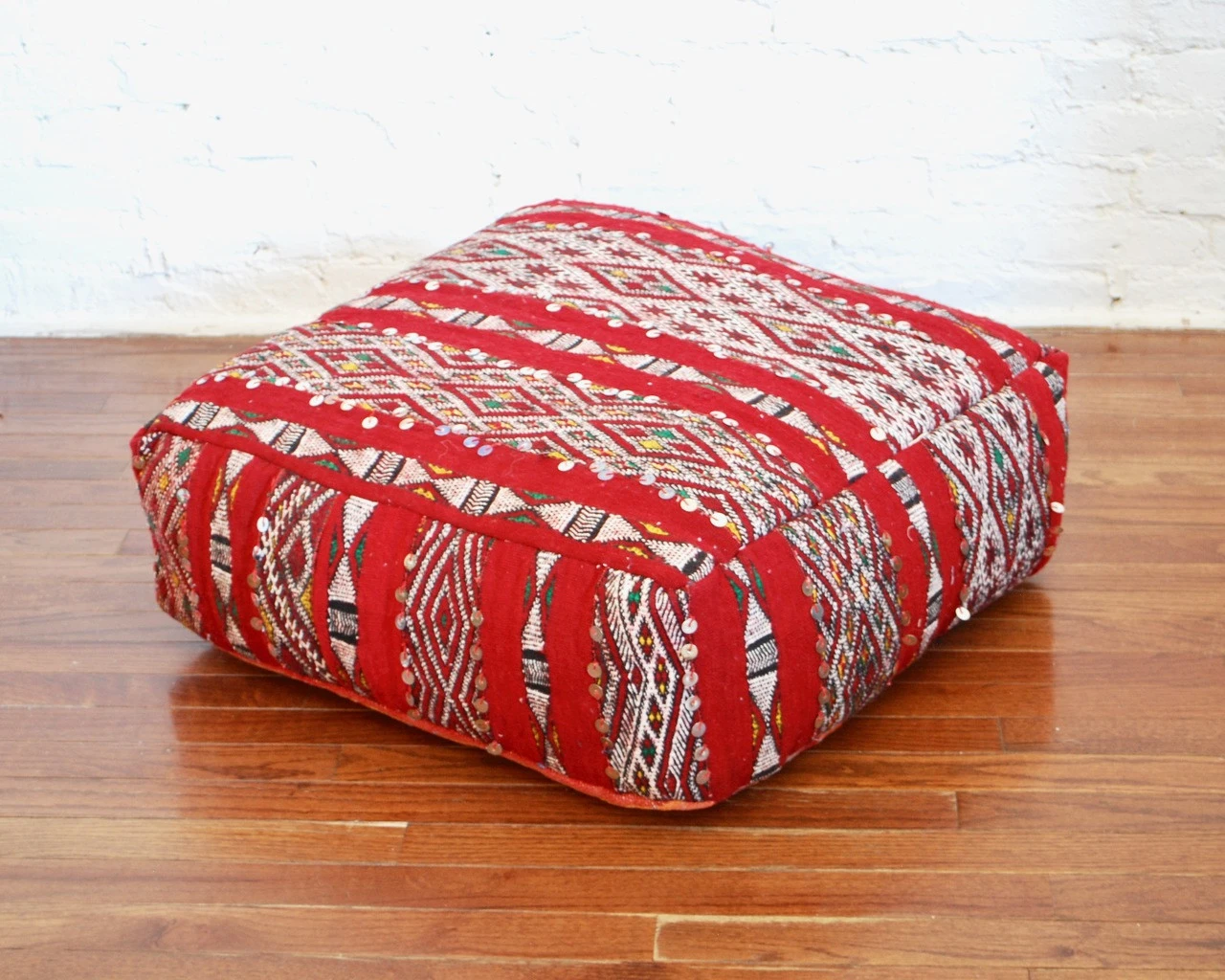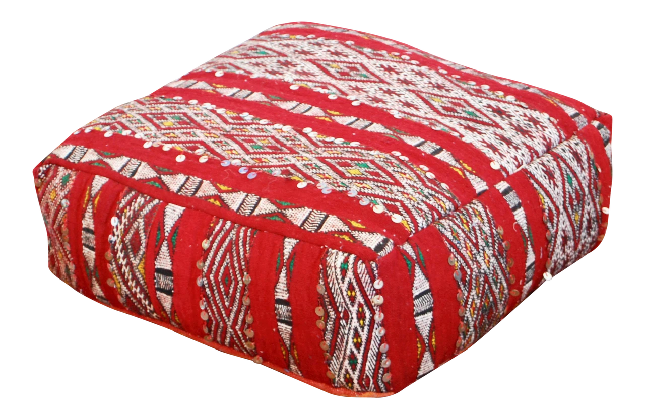 Crafted from vintage kilims, these Moroccan floor pillows are durable enough for indoor or outdoor use. Use them for additional seating, meditation or a low table. Each is one-of- a-kind, and some feature sparkling sequins.