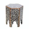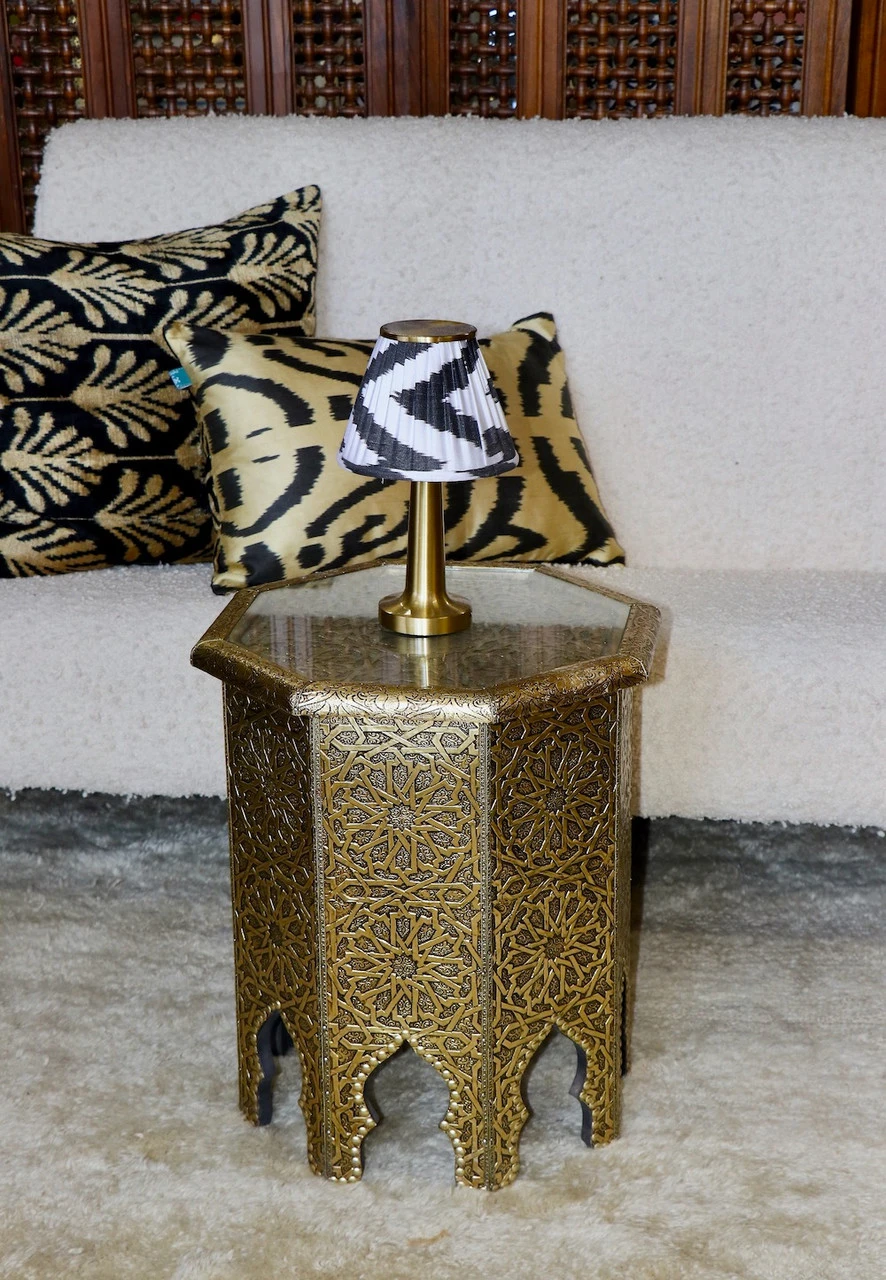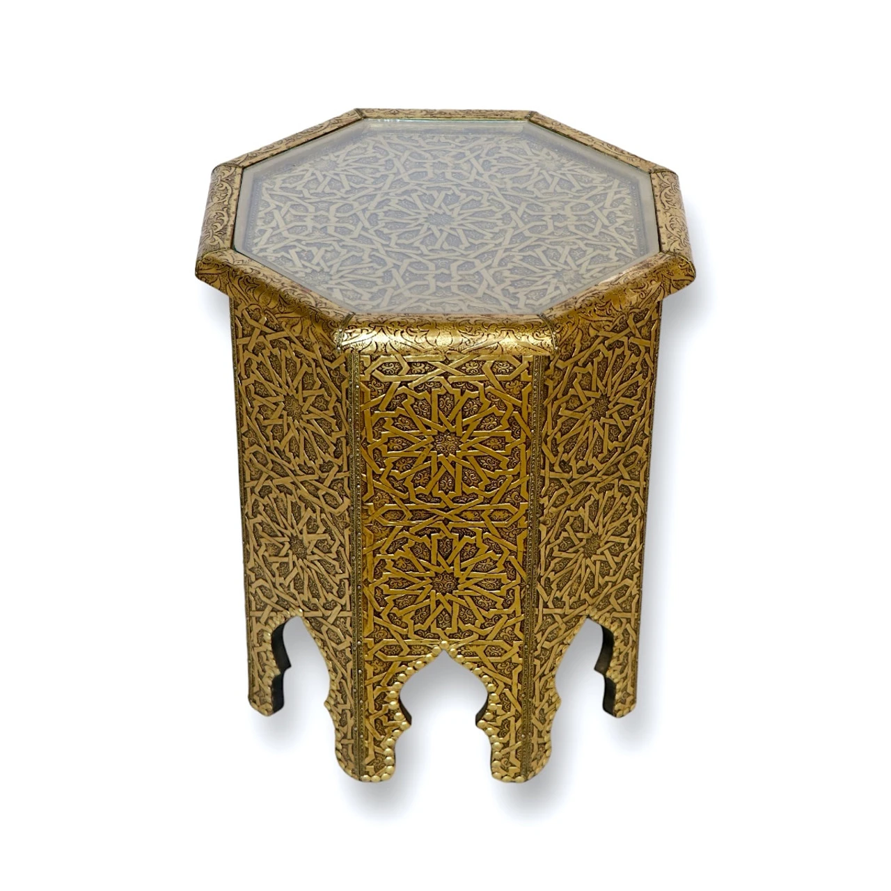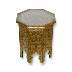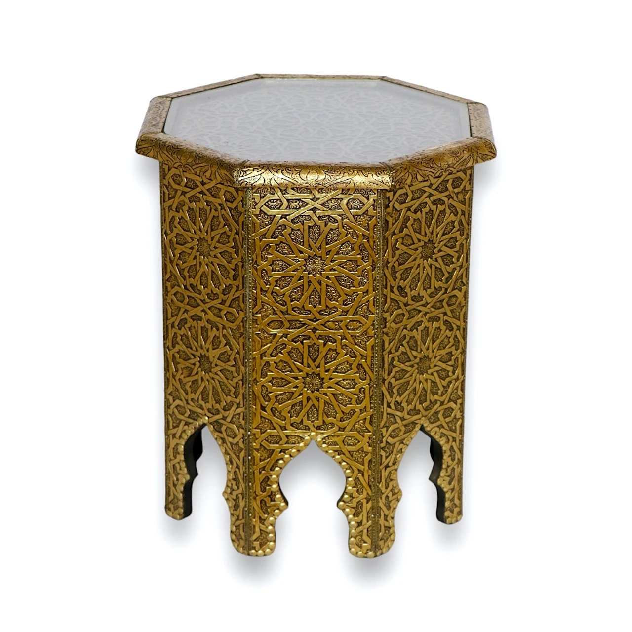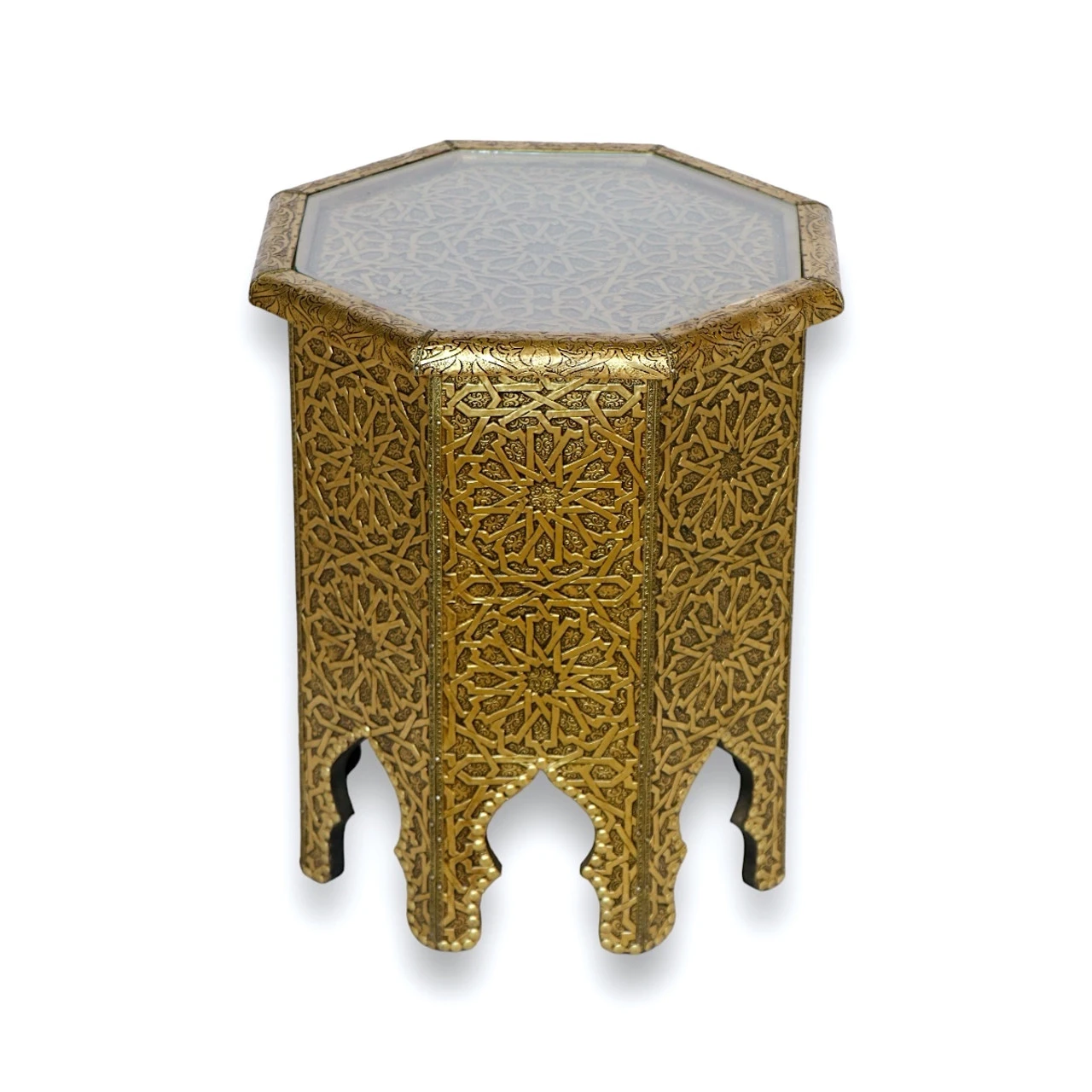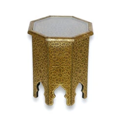 Discover the luxury of Moroccan craftsmanship with our compact golden metal side table, a statement piece adorned with traditional, ornate etchings on a hexagonal silhouette. Perfect for adding an authentic Moroccan elegance your decor.