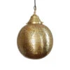 Instantly elevate your space and bring the touch of Moroccan vibe into your home with this large Moroccan Polished Brass Lamp. Handcrafted to perfection, this pierced and filigree polished vintage lamp can easily become a focal point in any room. It has a nice gold patina finish that complements the brass design. The pendant cast a pattern on the wall and ceiling when illuminated. It is hardwire-ready with a 3-feet adjustable chain.Â