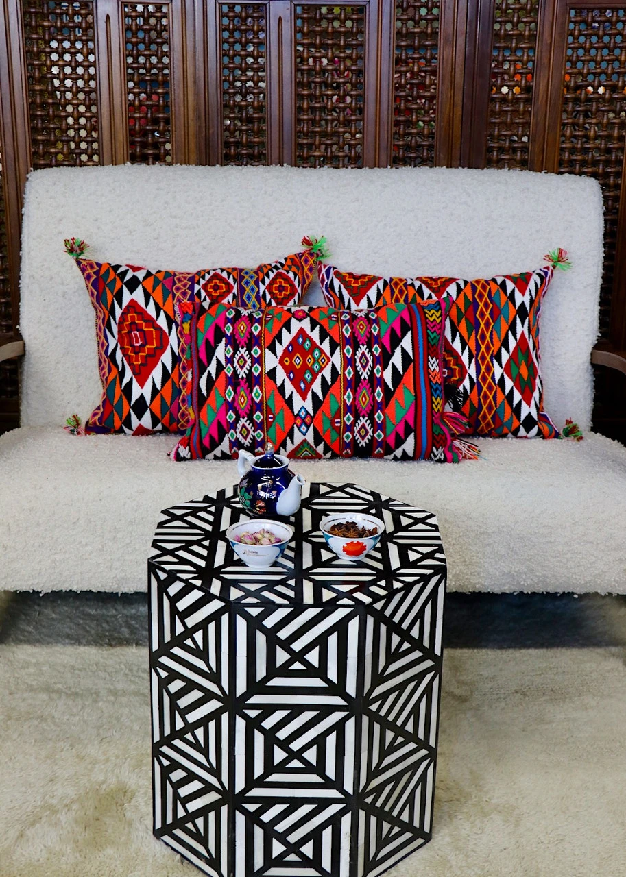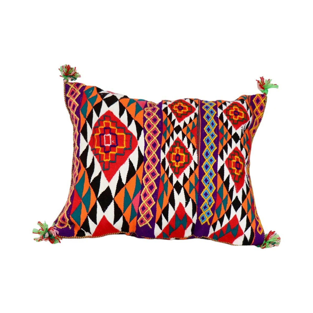 This vibrant pillow crafted from a repurposed Moroccan old rug, embodies the spirit of traditional Moroccan décor. Its bold, geometric patterns and rich, contrasting colors bring the artisanal essence of North African culture into your home. Each pillow is a tapestry of history, with its own story woven into the fabric, making it a unique and sustainable choice for those looking to infuse their space with authenticity and warmth.