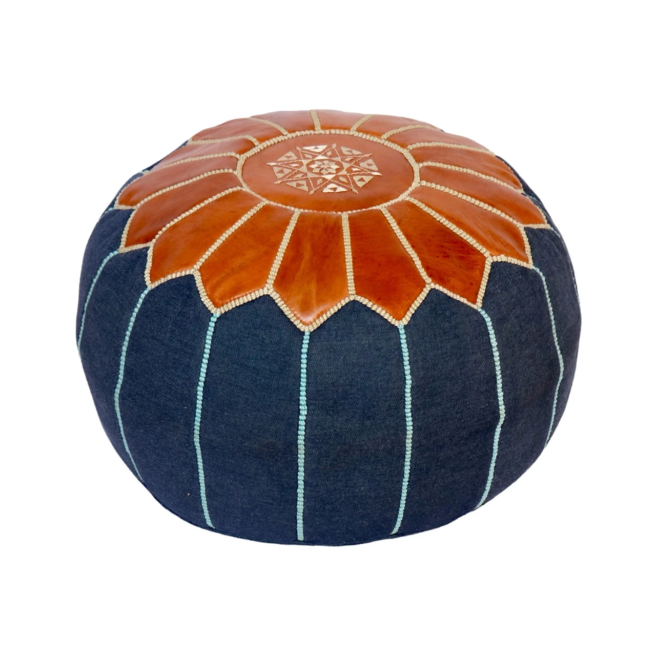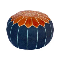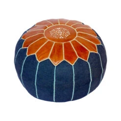This is a beautifully crafted Moroccan pouf, featuring a unique combination of rich leather and durable denim. The top displays a sunburst pattern in warm cognac leather, centered with an embossed geometric design, which contrasts elegantly with the deep blue denim sides. The sides are adorned with stitched lines in a lighter shade, enhancing the handcrafted appeal. This pouf not only serves as a versatile piece of furniture, perfect for seating or as a footrest but also adds a touch of artisanal charm to any room. The mix of materials and the detailed craftsmanship make it a standout piece that celebrates traditional Moroccan artisanship with a contemporary twist.