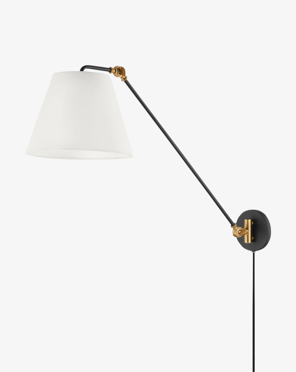 A modern version of the classic task lamp, the Navin Plug-In Sconce catches the eye with its textured black and patina brass finishes. Its adjustable arm holds a simple off-white linen shade, bringing warm light to your space.