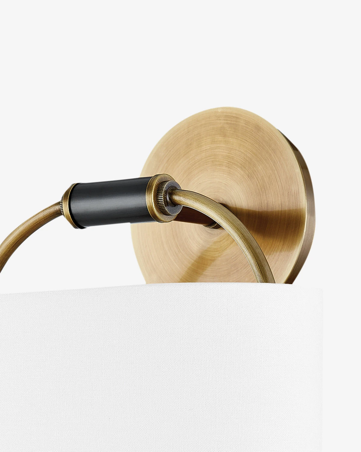 In an elegant design, the Pete Wall Sconce blends traditional materials with a contemporary feel. Its white linen shade is suspended by an exaggerated hook to complement its circular backplate. With a seamless mix of materials, this sconce brings warm light to any room.