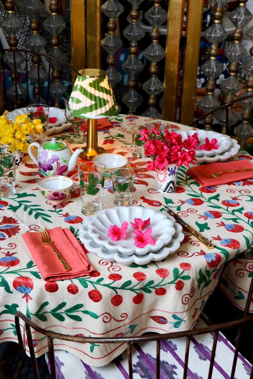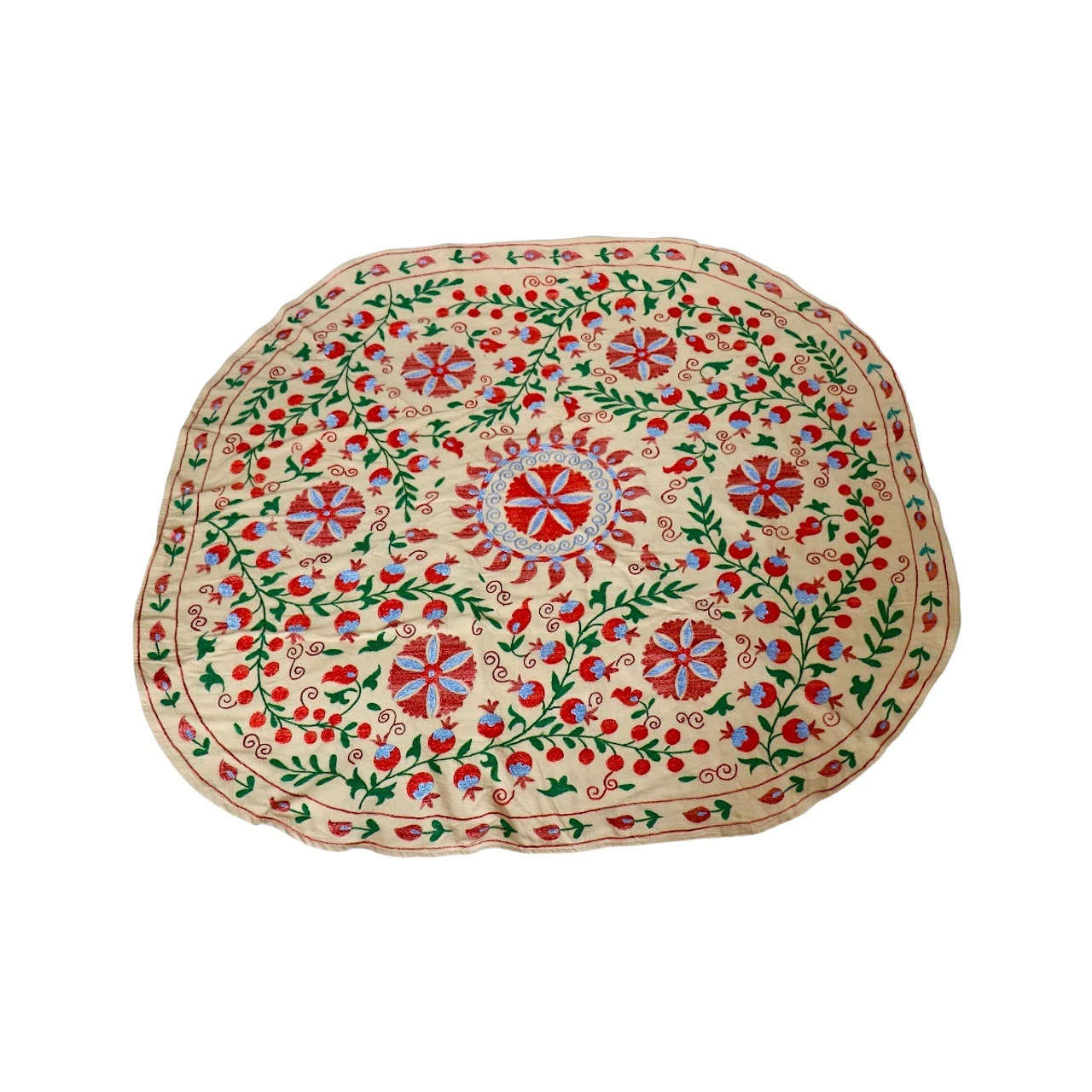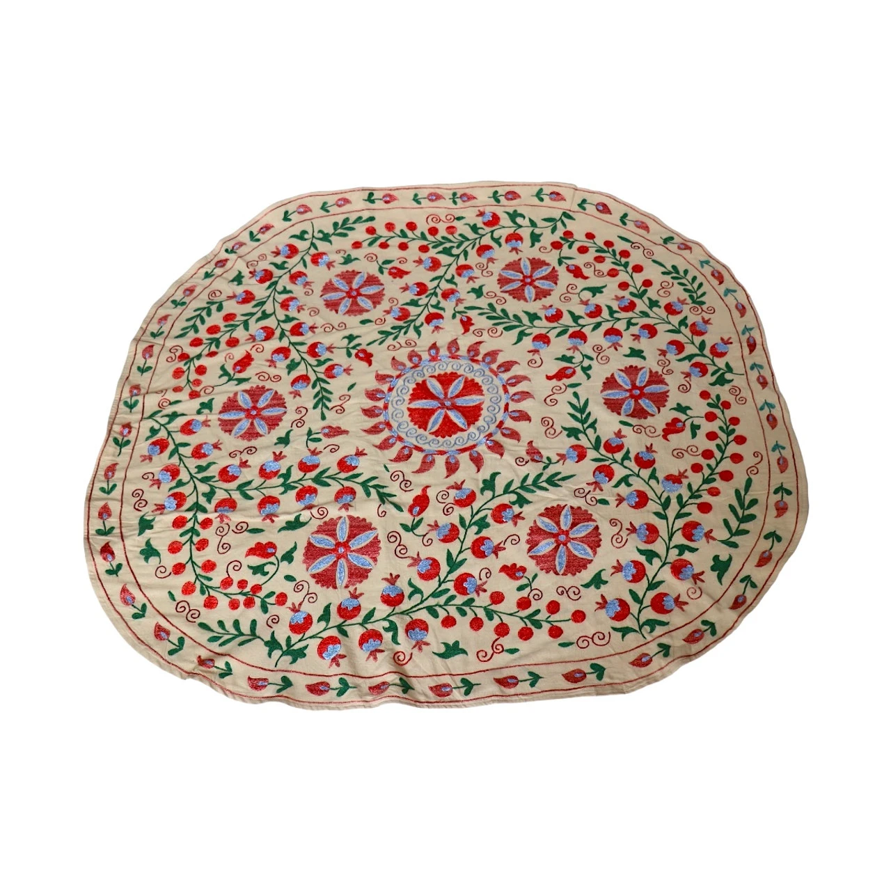 Add a touch of exotic elegance to your dining experience with our round Suzani Tablecloth. Originating from Central Asia, Suzani fabric is celebrated for its vibrant colors and intricate embroidery, creating a stunning focal point for any table setting. Elevate your dining space with the rich cultural heritage and luxurious feel of Suzani fabric.