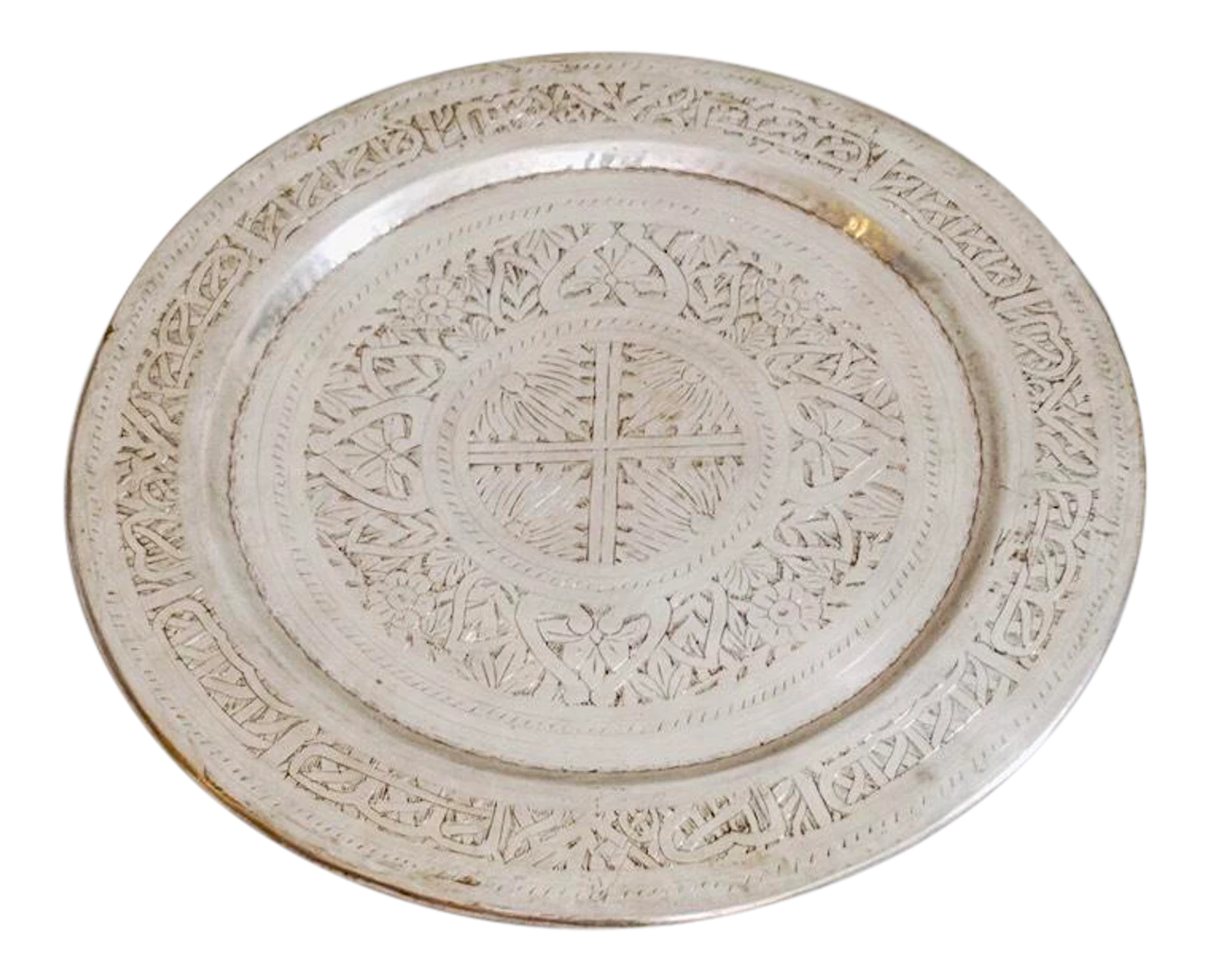 This ornate brass Indian tray has a silver finish. Can be used for serving, as décor or on top of a pouf to create an impromptu table. Made in India.