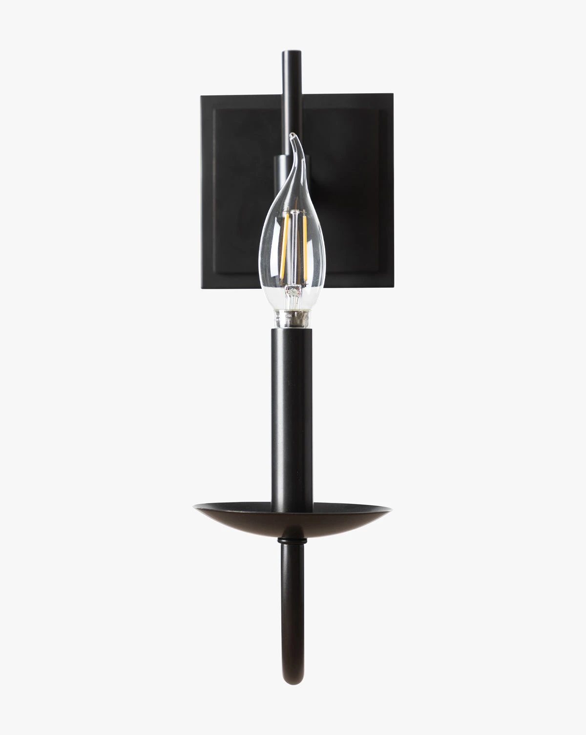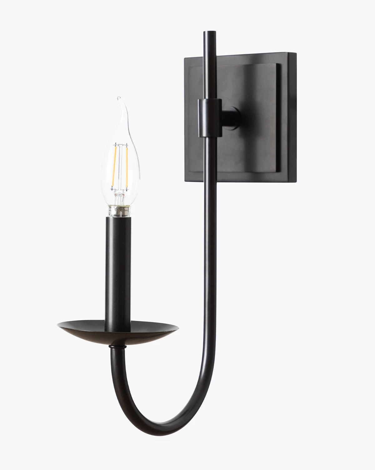Streamlined yet inviting, the candelabra-style Southwark Sconce is available in either an antique brass or oil rubbed bronze finish. The gently curved arm is mounted to a square backplate, lending refinement and balance to your decor.