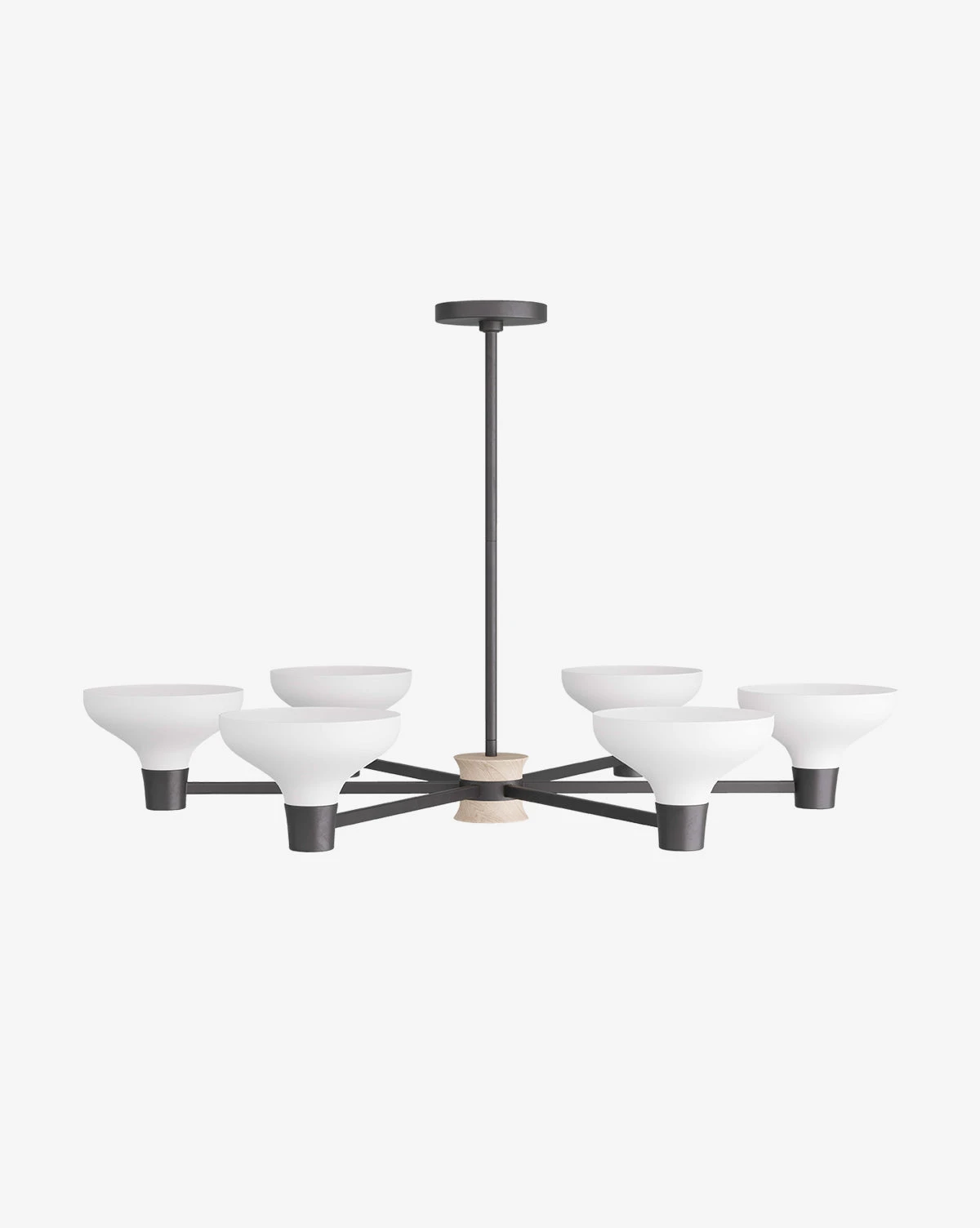 Open and shapely white gesso iron shades draw the eye to the Thatcher Chandelier. With subtly mixed materials, the wood detail on this chandelier brings modern refinement to your decor and a welcoming presence among your interior lighting.