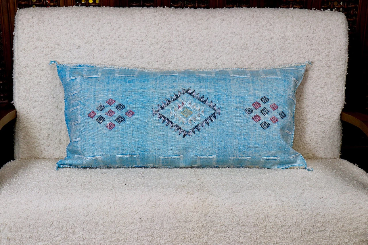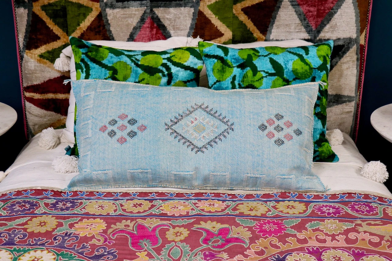 Discover the allure of Moroccan craftsmanship with our turquoise cactus silk Pillows. These Moroccan cactus Pillows are perfect for adding a refined boho vibe to any space. Each Pillow is detailed with handwork of Moroccan textiles originally as rugs but turned into pillows.