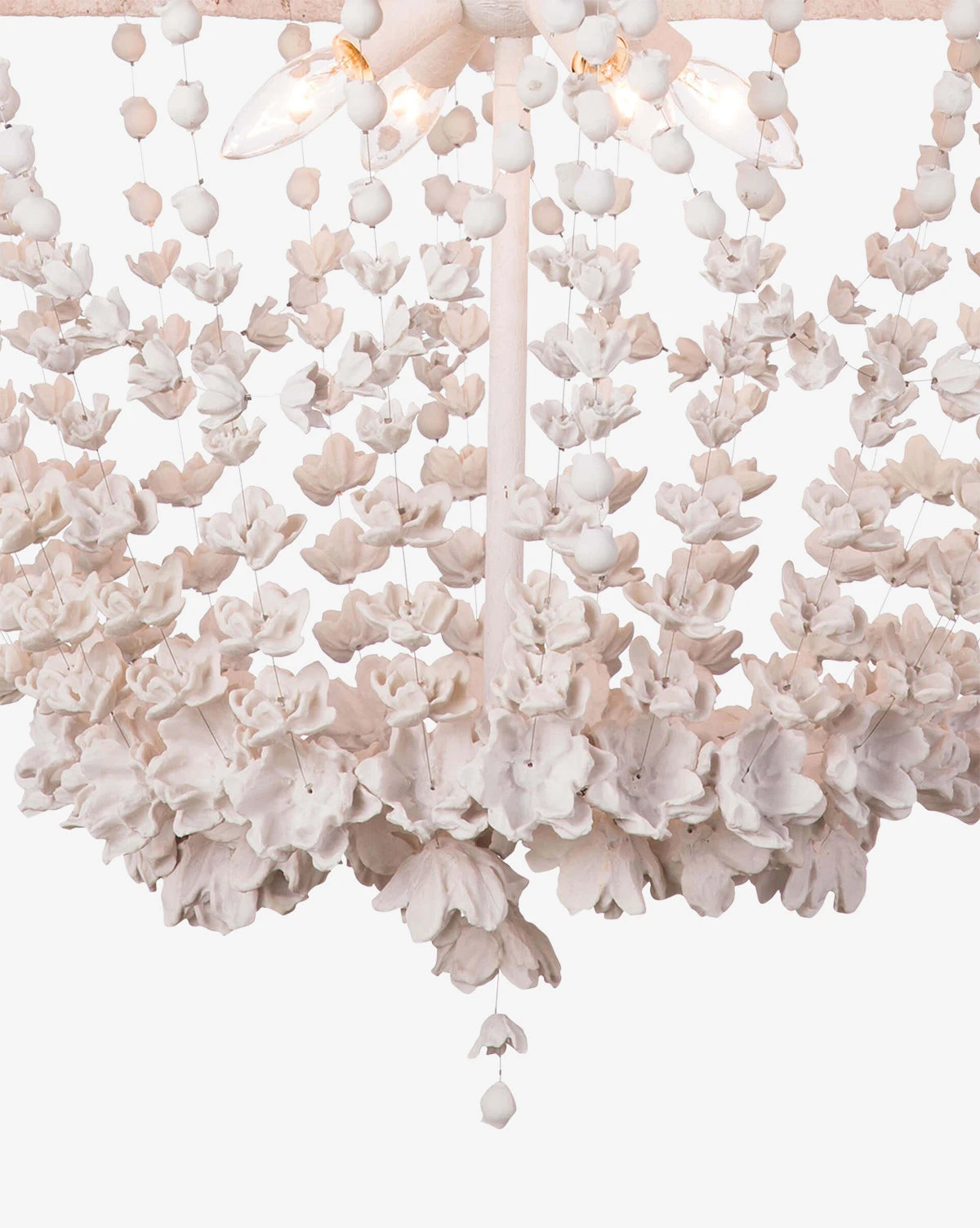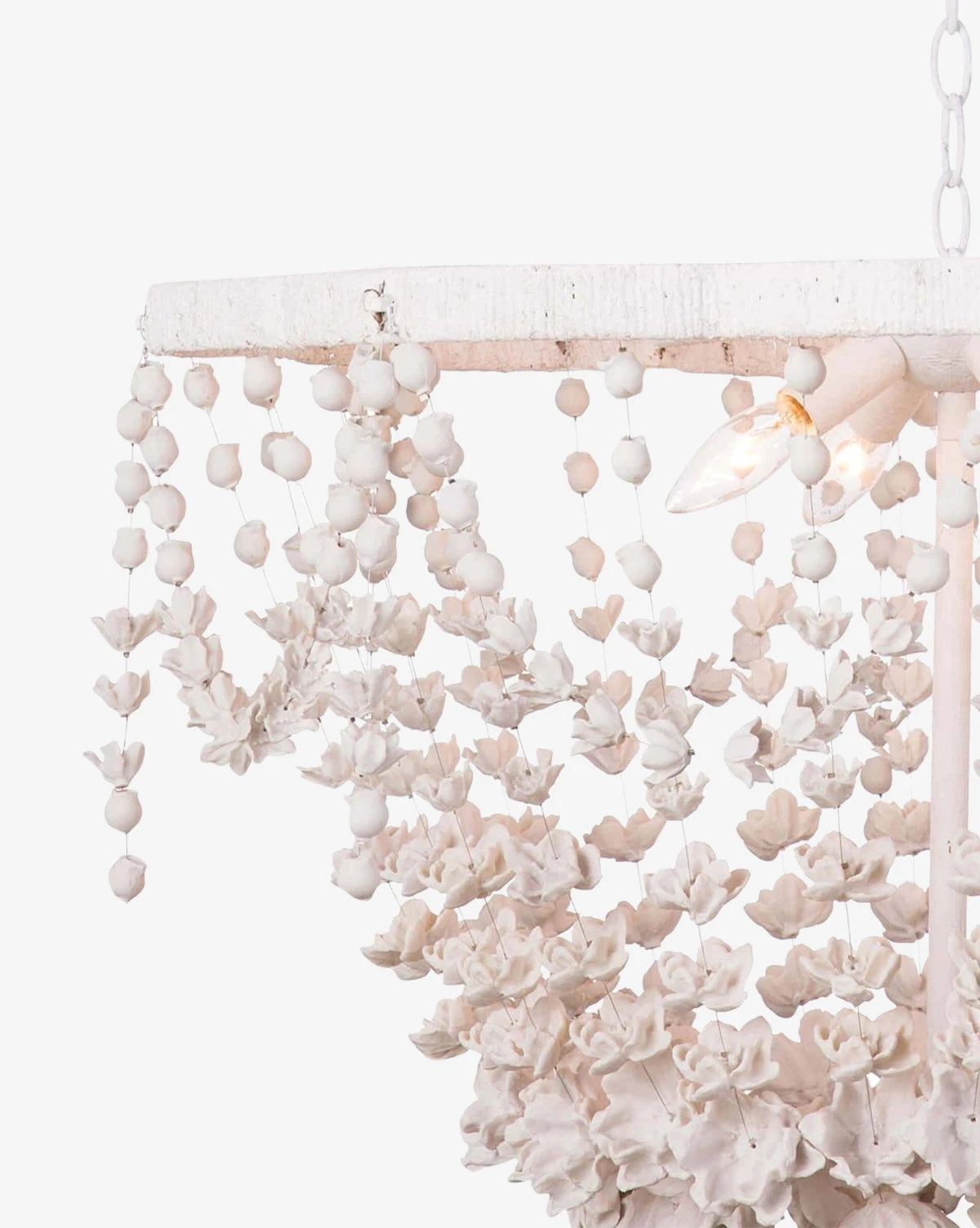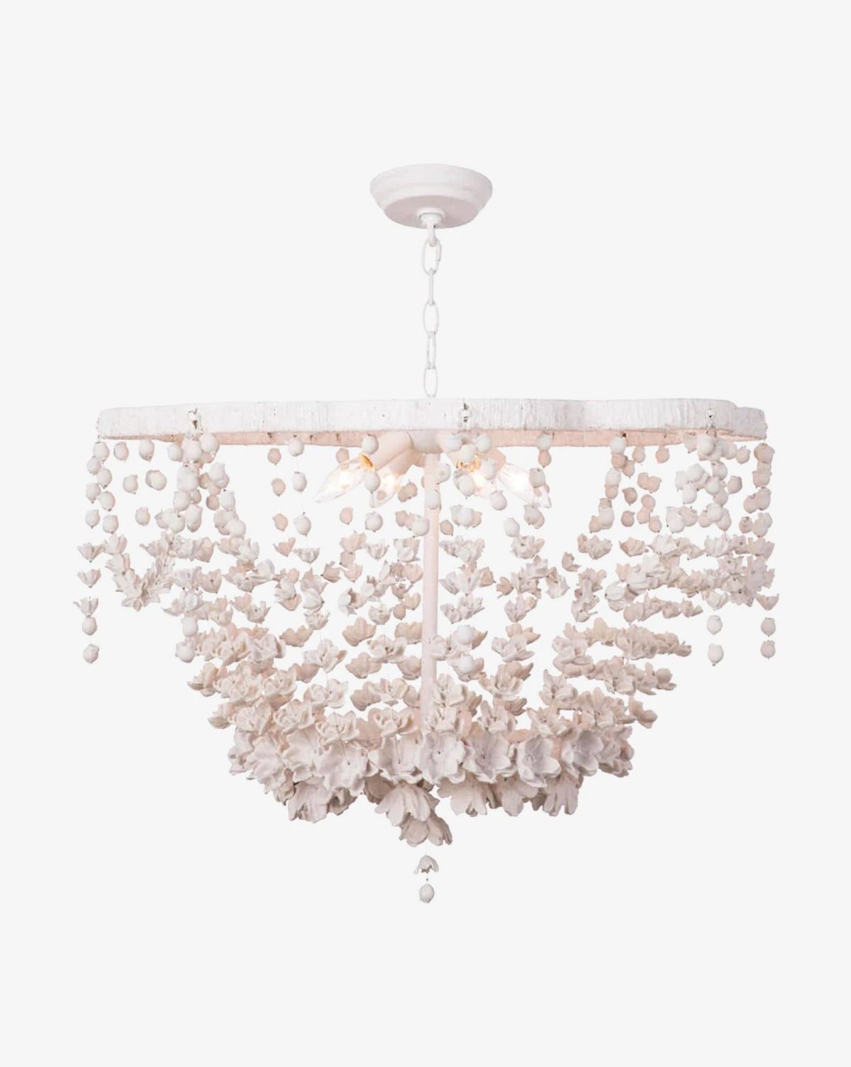 With delicate white florals strung together around its frame, the Vanessa Basin Chandelier creates a beautiful decorative moment in your space. Simple in palette, a white resin finish adds texture and an antique feel to the chandelier.