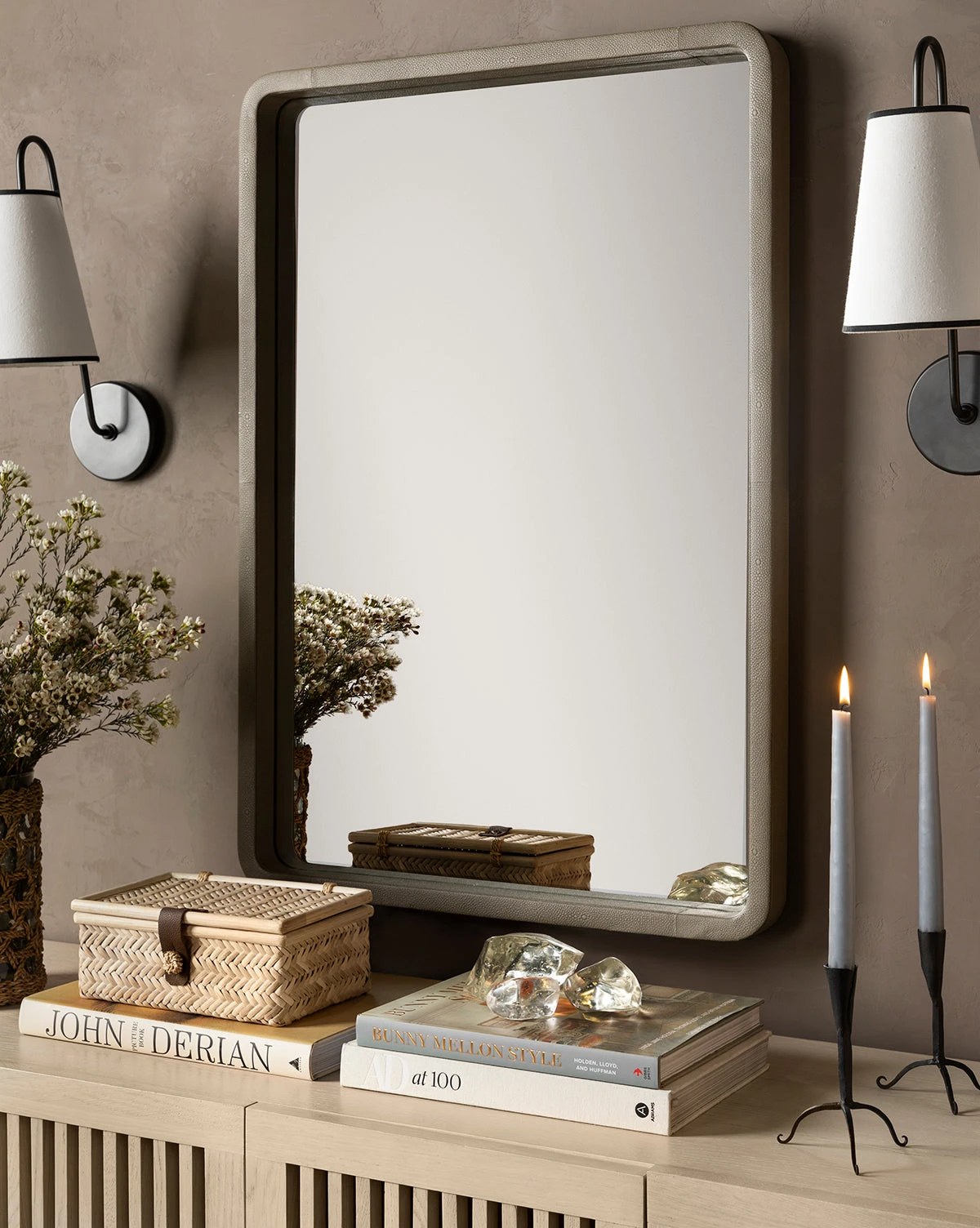 Our Winnie Wicker Box features a classic rectangular lidded construction with an organic feel. Intricately woven from wicker in a beautiful pattern, the box is complete with a leather latch that closes around a unique abaca fiber button, adding natural texture to your vignettes.