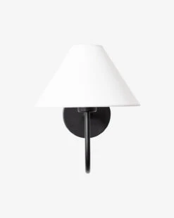 Defined by whimsical curves, we designed the Wolcott Sconce with a dramatic arm that offers a soft focal point in lighting designs anywhere in the home. Its arm and backplate are crafted from stainless steel plated metal and given a matte black finish, adding contrast to its traditional off-white shade.